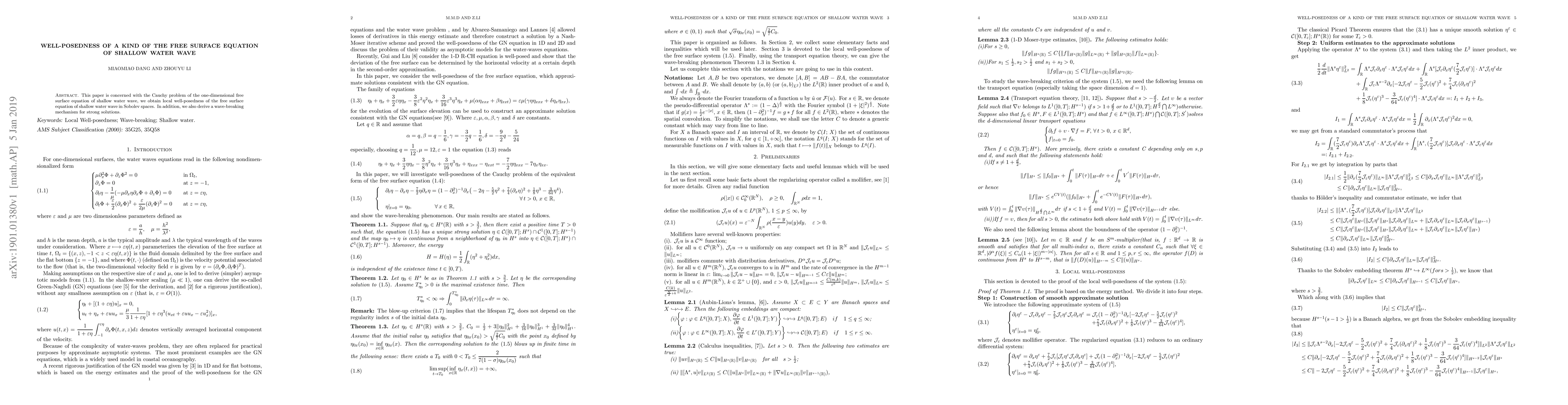 This paper establishes local well-posedness for the one-dimensional free surface equation of shallow water waves in Sobolev spaces and identifies a wave-breaking mechanism for strong solutions.