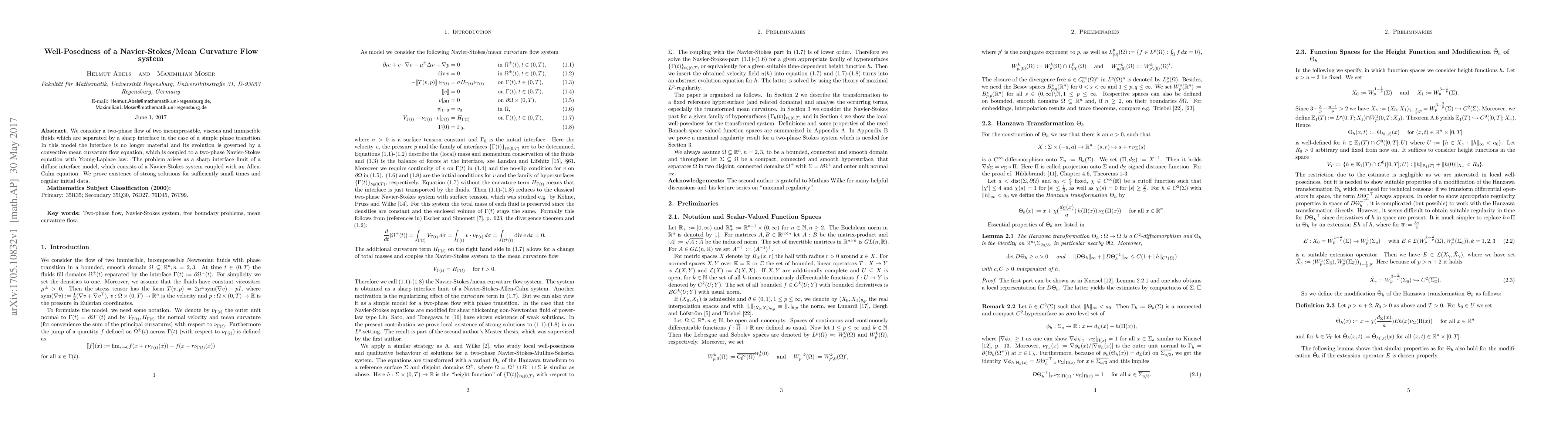 Researchers prove existence of strong solutions for a Navier-Stokes/Mean Curvature Flow system modeling two incompressible fluids with a sharp interface, valid for sufficiently small times and regular initial data.