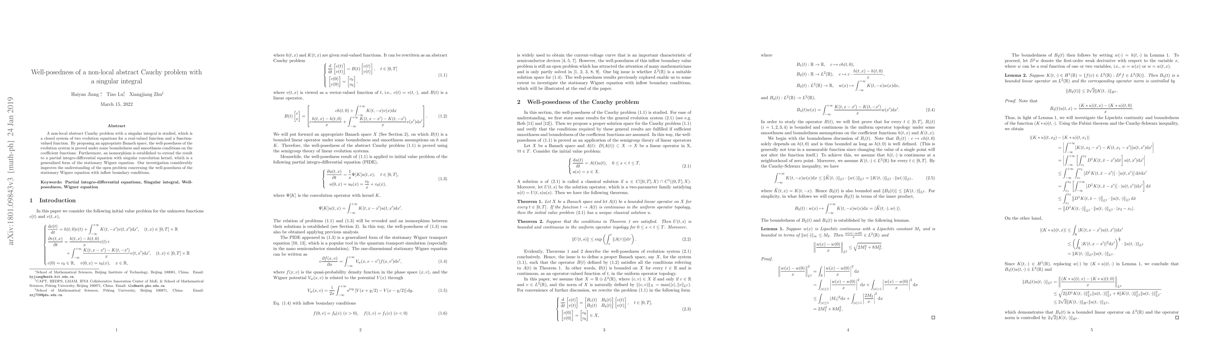 A non-local abstract Cauchy problem with a singular integral is studied, which is a closed system of two evolution equations for a real-valued function and a function-valued function. By proposing an appropriate Banach space, the well-posedness of the evolution system is proved under some boundedness and smoothness conditions on the coefficient functions. Furthermore, an isomorphism is established to extend the result to a partial integro-differential equation with singular convolution kernel, which is a generalized form of the stationary Wigner equation. Our investigation considerably improves the understanding of the open problem concerning the well-posedness of the stationary Wigner equation with inflow boundary conditions.