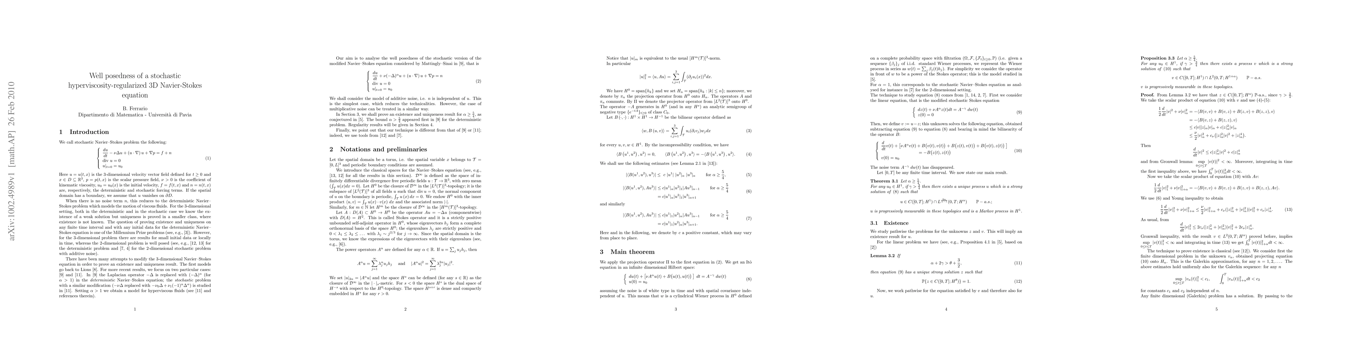 We analyse the well posedness of a stochastic hyperviscosity-regularized 3D Navier-Stokes equation; this is the Navier-Stokes equation in which the Laplace operator is replaced by its a-power for a>1. We prove existence and uniqueness for this equation assuming a>= 5/4.