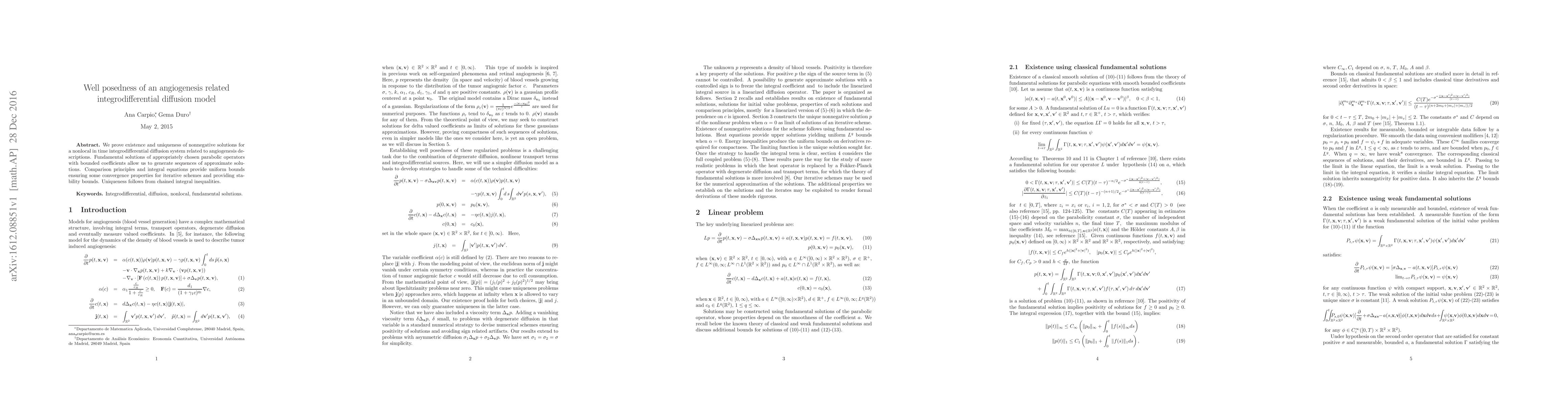 We prove existence and uniqueness of nonnegative solutions for a nonlocal in time integrodifferential diffusion system related to angiogenesis descriptions. Fundamental solutions of appropriately chosen parabolic operators with bounded coefficients allow us to generate sequences of approximate solutions. Comparison principles and integral equations provide uniform bounds ensuring some convergence properties for iterative schemes and providing stability bounds. Uniqueness follows from chained integral inequalities.