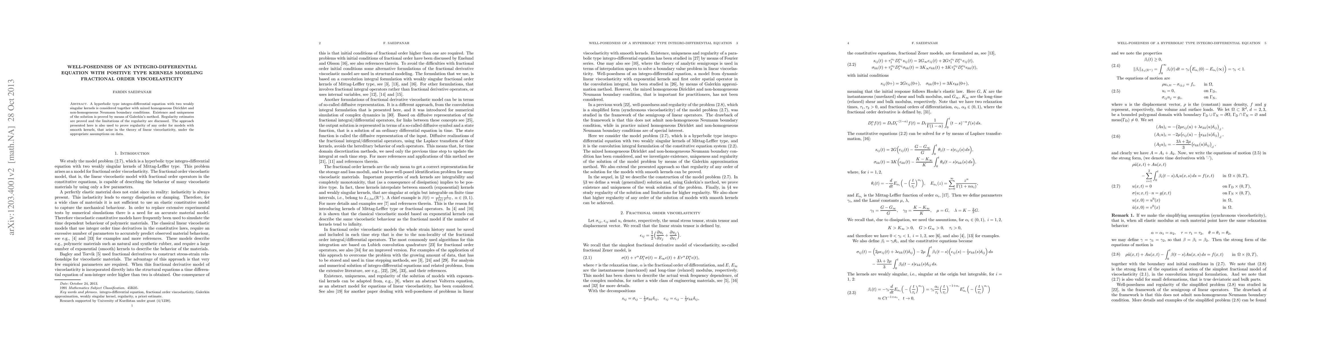 A hyperbolic type integro-differential equation with two weakly singular kernels is considered together with mixed homogeneous Dirichlet and non-homogeneous Neumann boundary conditions. Existence and uniqueness of the solution is proved by means of Galerkin's method. Regularity estimates are proved and the limitations of the regularity are discussed. The approach presented here is also used to prove regularity of any order for models with smooth kernels, that arise in the theory of linear viscoelasticity, under the appropriate assumptions on data.
