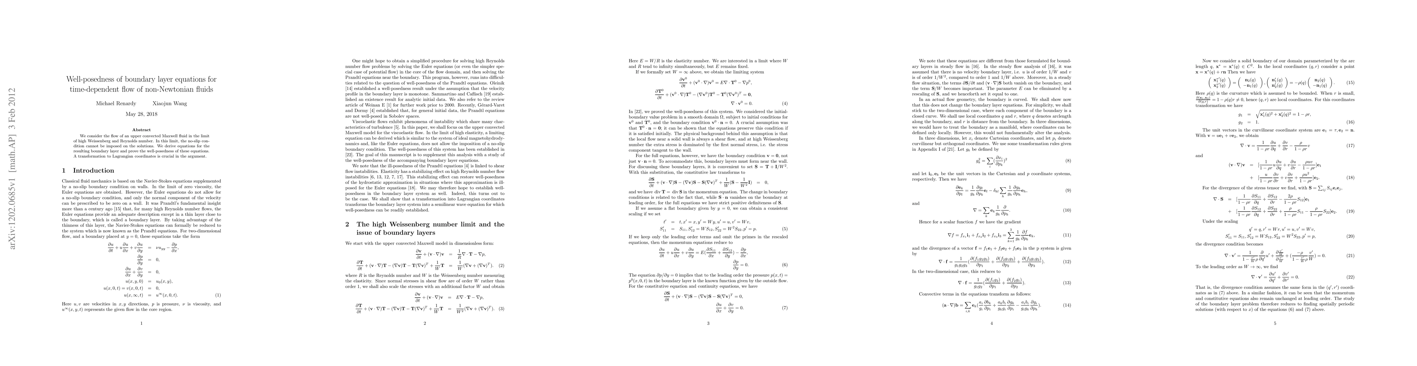 We consider the flow of an upper convected Maxwell fluid in the limit of high Weissenberg and Reynolds number. In this limit, the no-slip condition cannot be imposed on the solutions. We derive equations for the resulting boundary layer and prove the well-posedness of these equations. A transformation to Lagrangian coordinates is crucial in the argument.