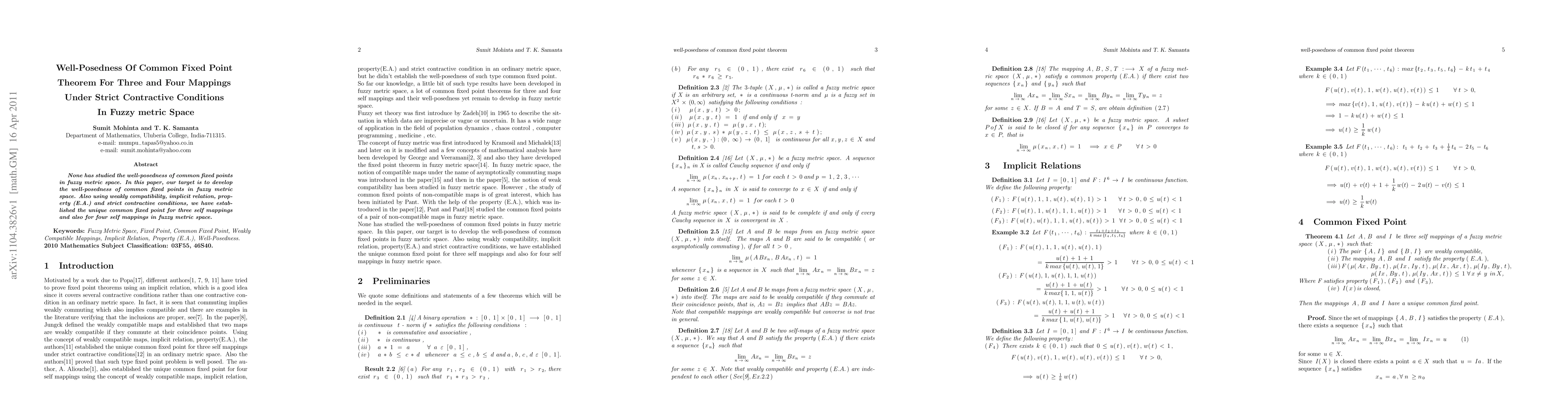 Researchers have established the existence of unique common fixed points for three and four self-mappings in a fuzzy metric space under strict contractive conditions, building on concepts such as weak compatibility and property (E.A.).