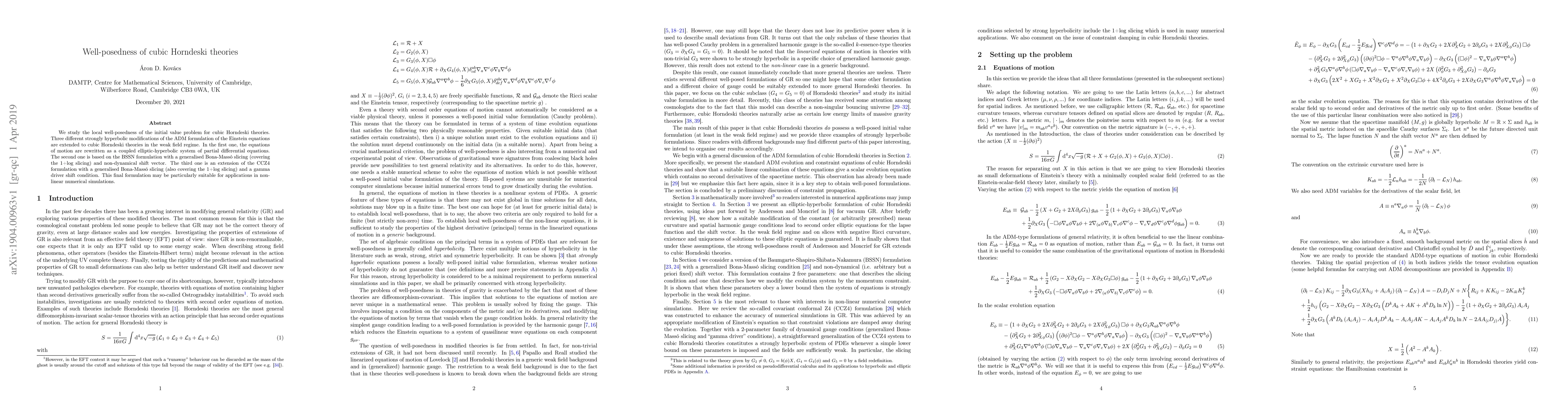 This paper investigates the local well-posedness of cubic Horndeski theories for initial value problems, extending three strongly hyperbolic modifications of the ADM formulation to this context, including a coupled elliptic-hyperbolic system, a BSSN formulation with a generalised Bona-Mass\'o slicing, and a CCZ4 extension with a gamma driver shift condition, which is promising for non-linear numerical simulations.