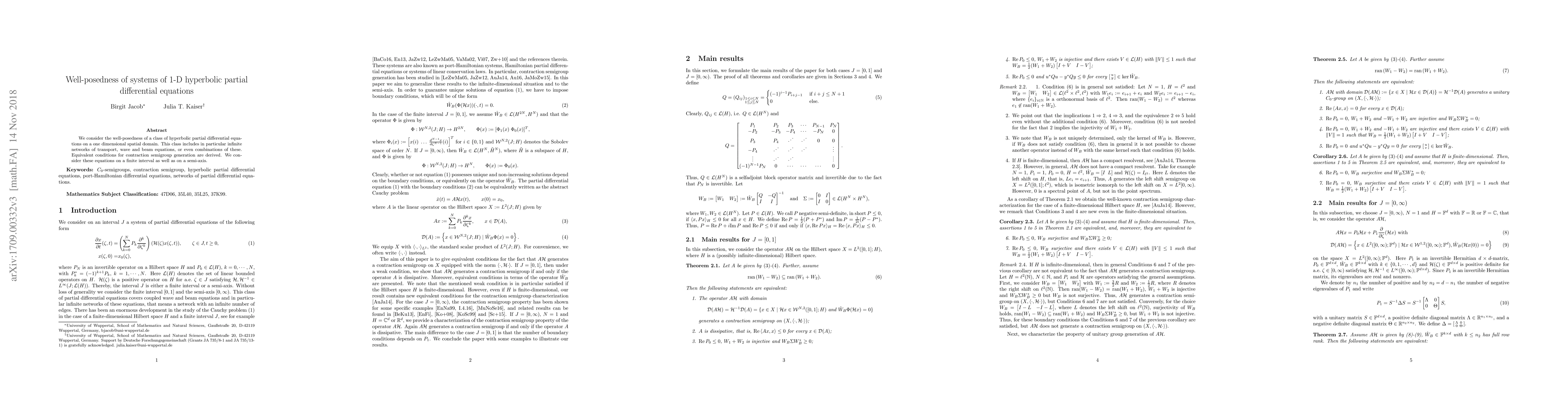 This paper investigates the well-posedness of hyperbolic partial differential equations in 1-D, focusing on networks of transport, wave, and beam equations. It derives conditions for the generation of contraction semigroups, examining both finite intervals and semi-axes.