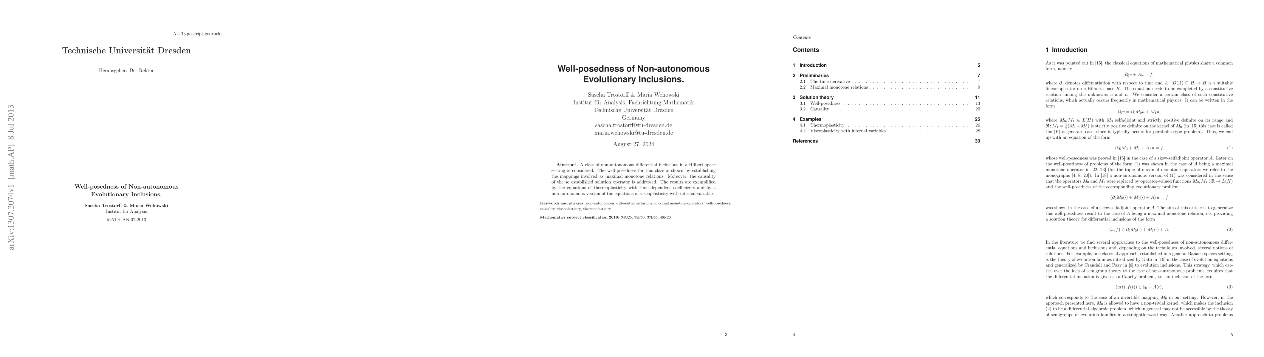This paper investigates the well-posedness of non-autonomous differential inclusions in Hilbert spaces, proving maximal monotonicity of involved mappings and addressing the causality of the solution operator. Examples include thermoplasticity and a non-autonomous viscoplasticity model.