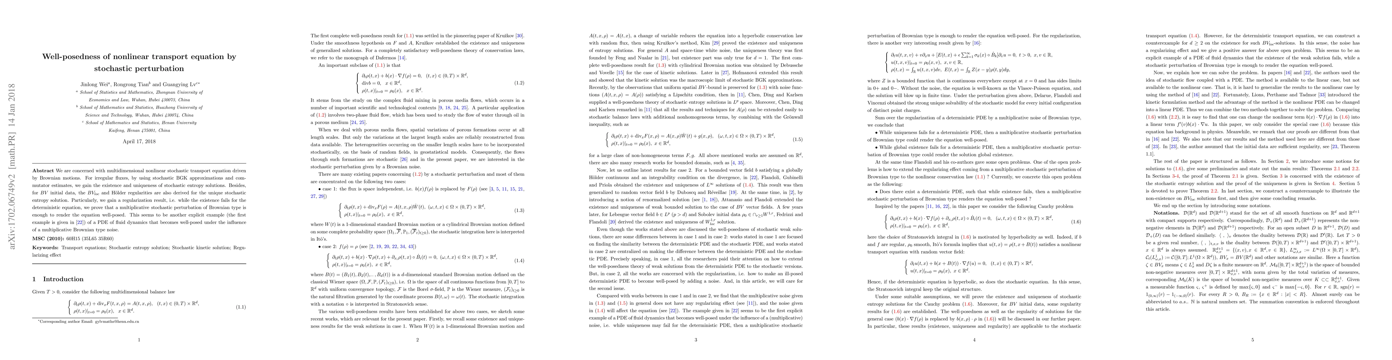 We are concerned with multidimensional nonlinear stochastic transport equation driven by Brownian motions. For irregular fluxes, by using stochastic BGK approximations and commutator estimates, we gain the existence and uniqueness of stochastic entropy solutions. Besides, for $BV$ initial data, the $BV$ and H\"older regularities are also derived for the unique stochastic entropy solution. Particularly, for the transport equation, we gain a regularization result, i.e. while the existence fails for the transport equation, we prove that a multiplicative stochastic perturbation of Brownian type is enough to render the equation well-posed. This seems to be another explicit example (the first example is given in [22]) of a PDE of fluid dynamics that becomes well-posed under the influence of a multiplicative Brownian type noise.