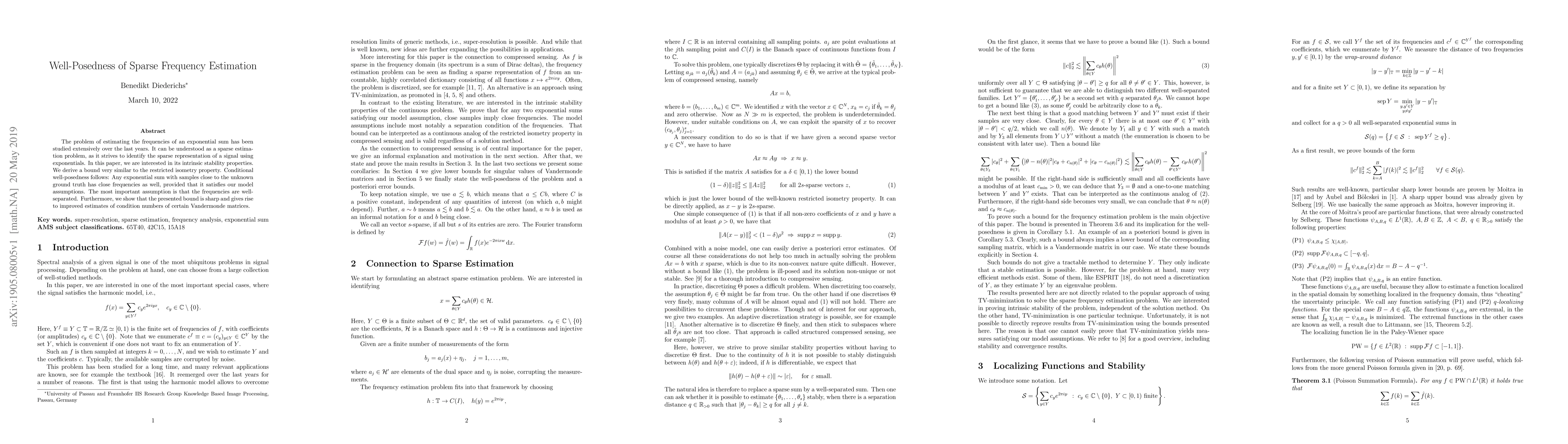 This paper investigates the stability properties of sparse frequency estimation in signal processing, showing that frequencies can be accurately estimated under certain assumptions about their separation, and deriving a bound similar to the restricted isometry property.