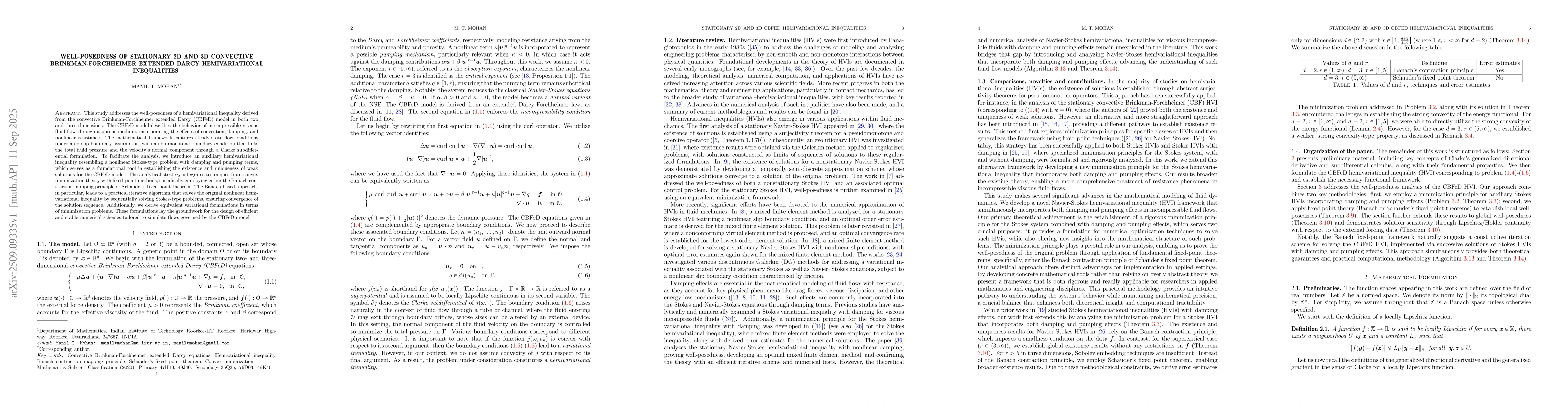 This study addresses the well-posedness of a hemivariational inequality derived from the convective Brinkman-Forchheimer extended Darcy (CBFeD) model in both two and three dimensions. The CBFeD model describes the behavior of incompressible viscous fluid flow through a porous medium, incorporating the effects of convection, damping, and nonlinear resistance. The mathematical framework captures steady-state flow conditions under a no-slip boundary assumption, with a non-monotone boundary condition that links the total fluid pressure and the velocity's normal component through a Clarke subdifferential formulation. To facilitate the analysis, we introduce an auxiliary hemivariational inequality resembling a nonlinear Stokes-type problem with damping and pumping terms, which serves as a foundational tool in establishing the existence and uniqueness of weak solutions for the CBFeD model. The analytical strategy integrates techniques from convex minimization theory with fixed-point methods, specifically employing either the Banach contraction mapping principle or Schauder's fixed point theorem. The Banach-based approach, in particular, leads to a practical iterative algorithm that solves the original nonlinear hemivariational inequality by sequentially solving Stokes-type problems, ensuring convergence of the solution sequence. Additionally, we derive equivalent variational formulations in terms of minimization problems. These formulations lay the groundwork for the design of efficient and stable numerical schemes tailored to simulate flows governed by the CBFeD model.