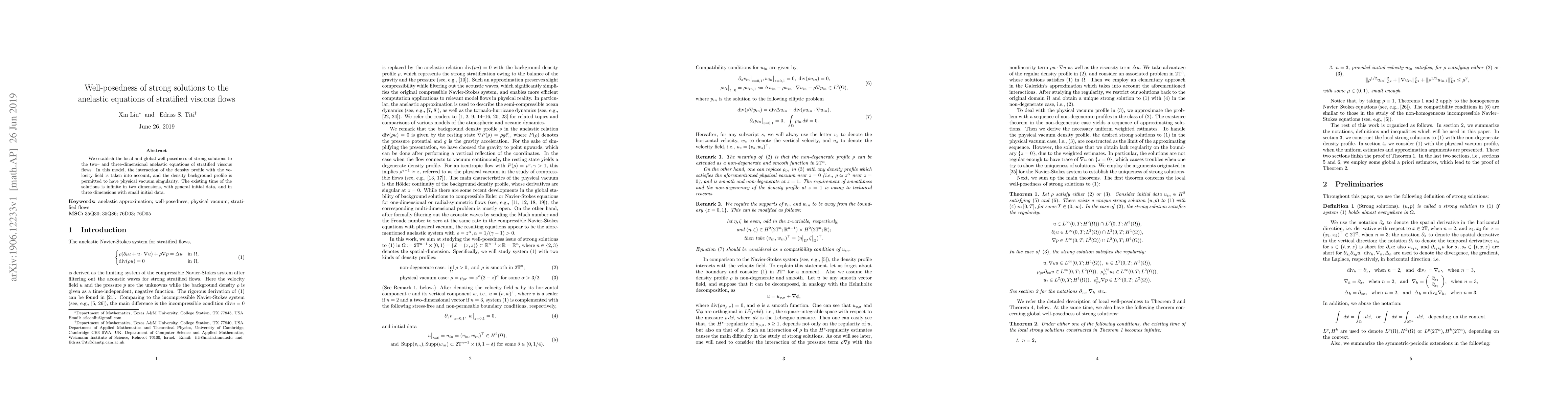 We establish the local and global well-posedness of strong solutions to the two- and three-dimensional anelastic equations of stratified viscous flows. In this model, the interaction of the density profile with the velocity field is taken into account, and the density background profile is permitted to have physical vacuum singularity. The existing time of the solutions is infinite in two dimensions, with general initial data, and in three dimensions with small initial data.
