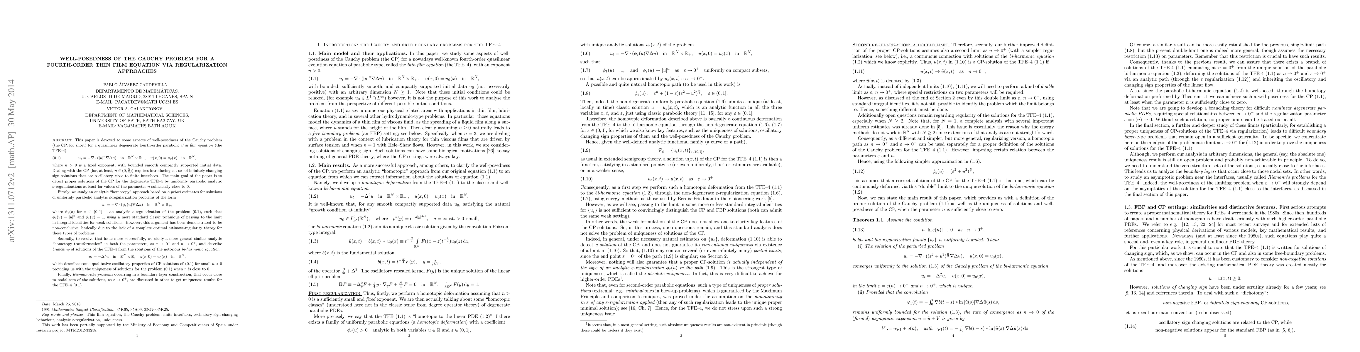 This paper investigates the well-posedness of a specific fourth-order thin film equation using regularization approaches, aiming to detect proper solutions for values of the parameter n sufficiently close to 0.
