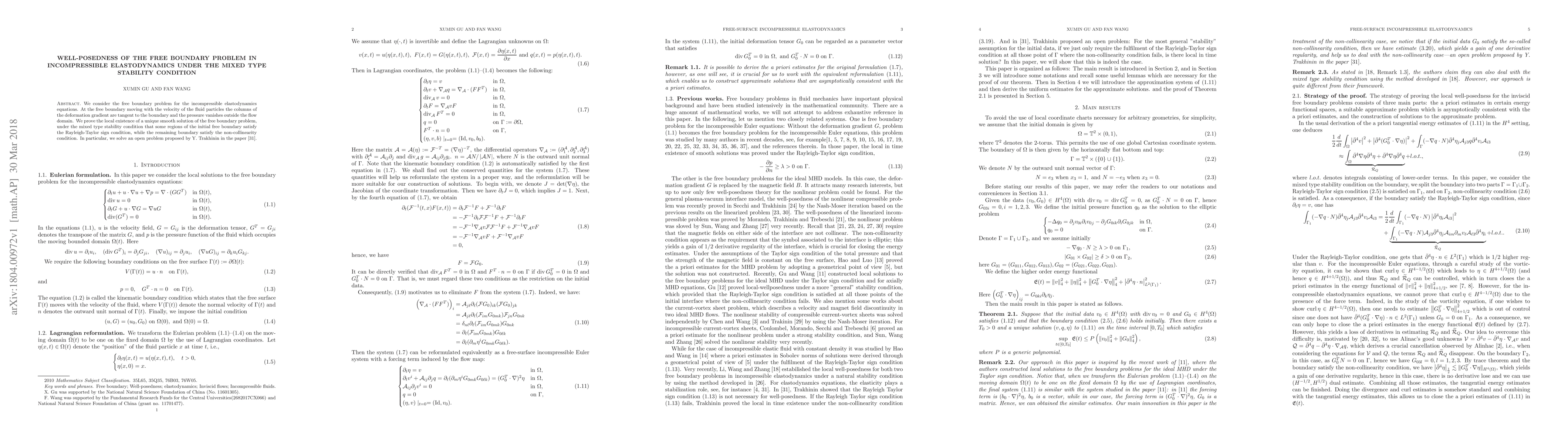 This paper proves the local existence and uniqueness of a smooth solution for the free boundary problem in incompressible elastodynamics, under a mixed type stability condition combining the Rayleigh-Taylor sign condition and the non-collinearity condition for different regions of the initial boundary. It resolves an open problem posed by Y. Trakhinin.