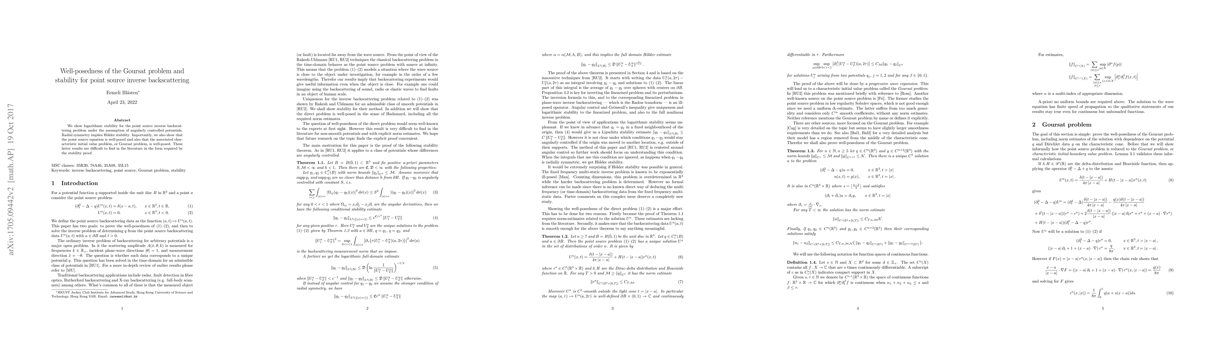 The paper demonstrates logarithmic stability for the point source inverse backscattering problem with angularly controlled potentials, achieving Hölder stability through radial symmetry. It also proves the well-posedness of the point source equation and its associated Goursat problem, filling a gap in existing literature.