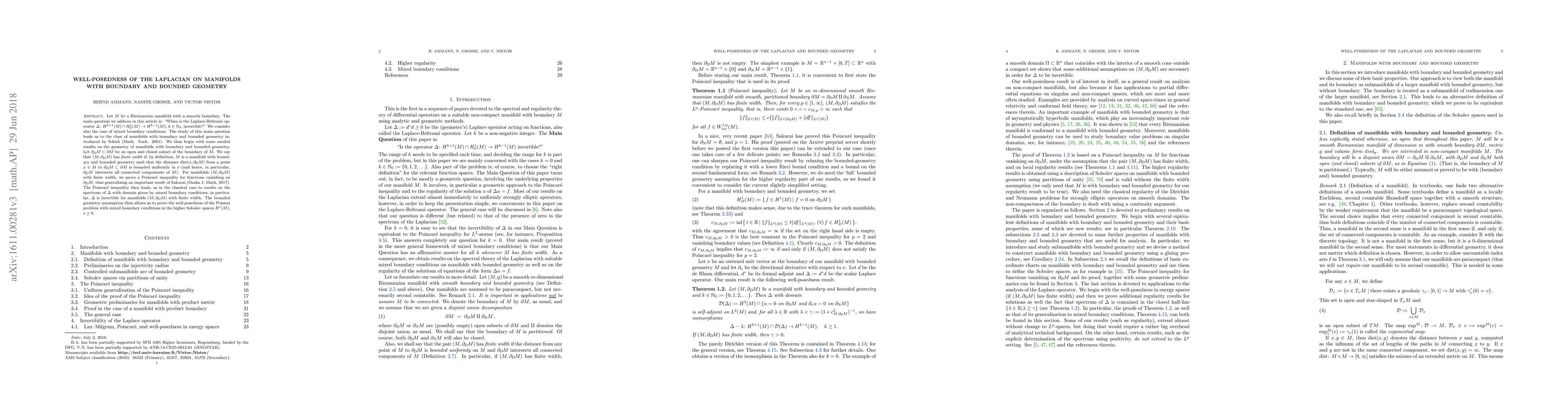 Let $M$ be a Riemannian manifold with a smooth boundary. The main question we address in this article is: "When is the Laplace-Beltrami operator $\Delta\colon H^{k+1}(M)\cap H^1_0(M) \to H^{k-1}(M)$, $k\in \mathbb{N}_0$, invertible?" We consider also the case of mixed boundary conditions. The study of this main question leads us to the class of manifolds with boundary and bounded geometry introduced by Schick (Math. Nach. 2001). We begin with some needed results on the geometry of manifolds with boundary and bounded geometry. Let $\partial_D M \subset \partial M$ be an open and closed subset of the boundary of $M$. We say that $(M, \partial_D M)$ has \emph{finite width} if, by definition, $M$ is a manifold with boundary and bounded geometry such that the distance $d(x, \partial_D M)$ from a point $x \in M$ to $\partial_D M \subset \partial M$ is bounded uniformly in $x$ (and hence, in particular, $\partial_D M$ intersects all connected components of $M$). For manifolds $(M, \partial_D M)$ with finite width, we prove a Poincar\'e inequality for functions vanishing on $\partial_D M$, thus generalizing an important result of Sakurai (Osaka J. Math, 2017). The Poincar\'e inequality then leads, as in the classical case to results on the spectrum of $\Delta$ with domain given by mixed boundary conditions, in particular, $\Delta$ is invertible for manifolds $(M, \partial_D M)$ with finite width. The bounded geometry assumption then allows us to prove the well-posedness of the Poisson problem with mixed boundary conditions in higher Sobolev spaces $H^s(M)$, $s \ge 0$.