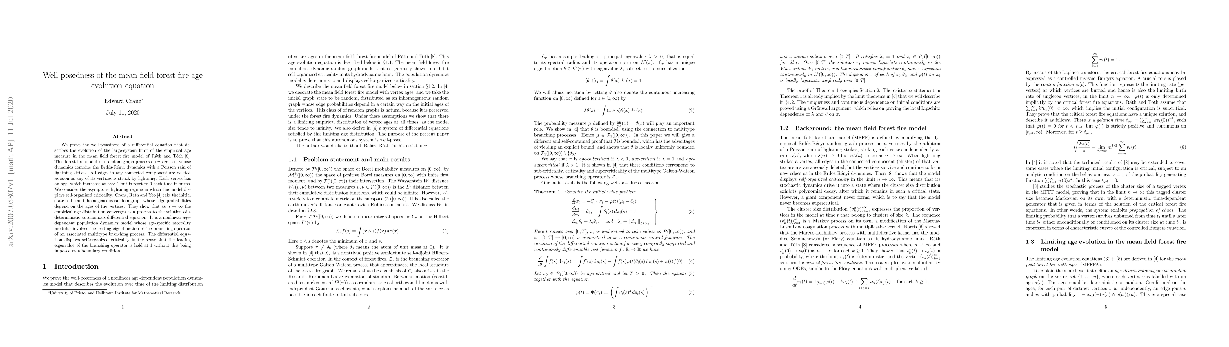 We prove the well-posedness of a differential equation that describes the evolution of the large-system limit of the empirical age measure in the mean field forest fire model of R\'ath and T\'oth (arXiv:0808.2116). This forest fire model is a random graph process on $n$ vertices, whose dynamics combine the Erd\H{o}s-R\'enyi dynamics with a Poisson rain of lightning strikes. All edges in any connected component are deleted as soon as any of its vertices is struck by lightning. Each vertex has an age, which increases at rate $1$ but is reset to $0$ each time it burns. We consider the asymptotic lightning regime in which the model displays self-organized criticality. Crane, R\'ath and Yeo (arXiv:1811.07981) take the initial state to be an inhomogeneous random graph whose edge probabilities depend on the ages of the vertices. They show that as $n \to \infty$ the empirical age distribution converges as a process to the solution of a deterministic autonomous differential equation. It is a nonlinear age-dependent population dynamics model whose age-specific mortality modulus involves the leading eigenfunction of the branching operator of an associated multitype branching process. The differential equation displays self-organized criticality in the sense that the leading eigenvalue of the branching operator is held at $1$ without this being imposed as a boundary condition.