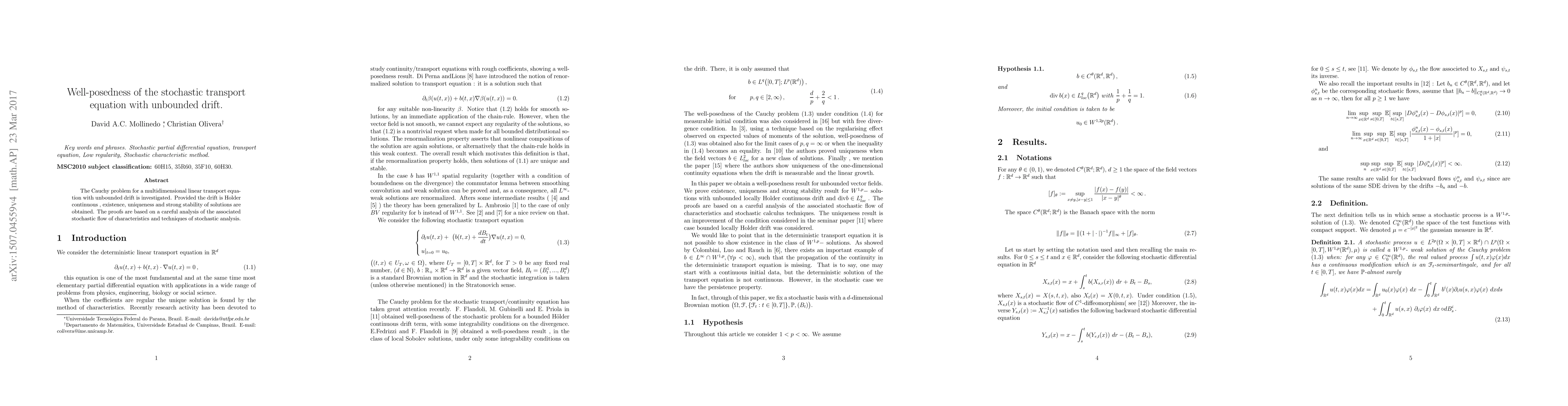 This paper investigates the well-posedness of a multidimensional linear transport equation with unbounded drift, proving existence, uniqueness, and strong stability under Holder continuity conditions. The proofs leverage an analysis of the stochastic flow of characteristics and stochastic analysis techniques.