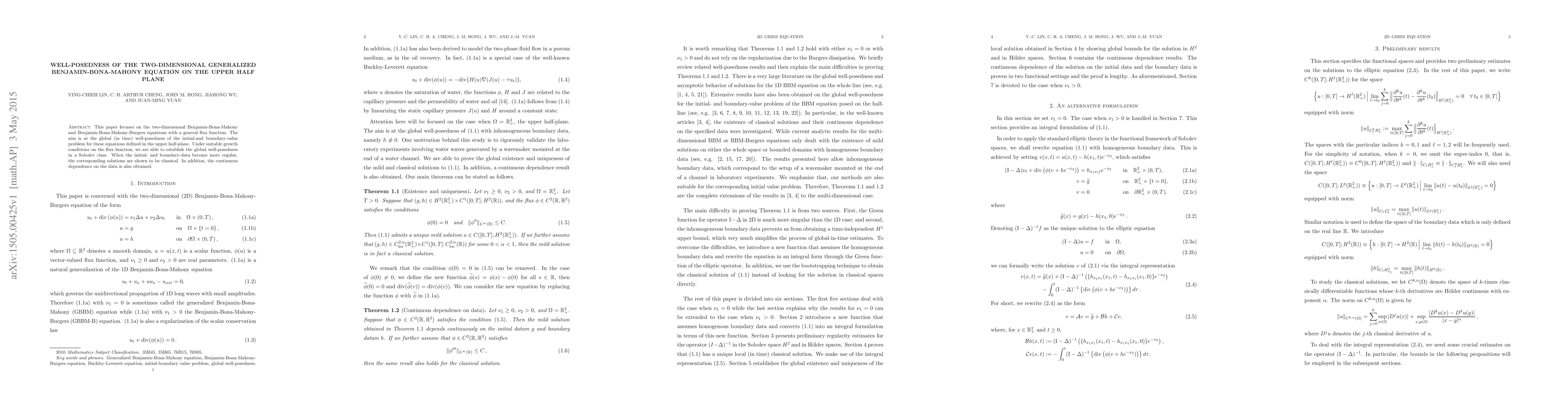 This paper establishes global well-posedness in a Sobolev class for the two-dimensional generalized Benjamin-Bona-Mahony and Benjamin-Bona-Mahony-Burgers equations in the upper half-plane, under suitable growth conditions on the flux function. Solutions are shown to be classical when initial and boundary data are sufficiently regular.