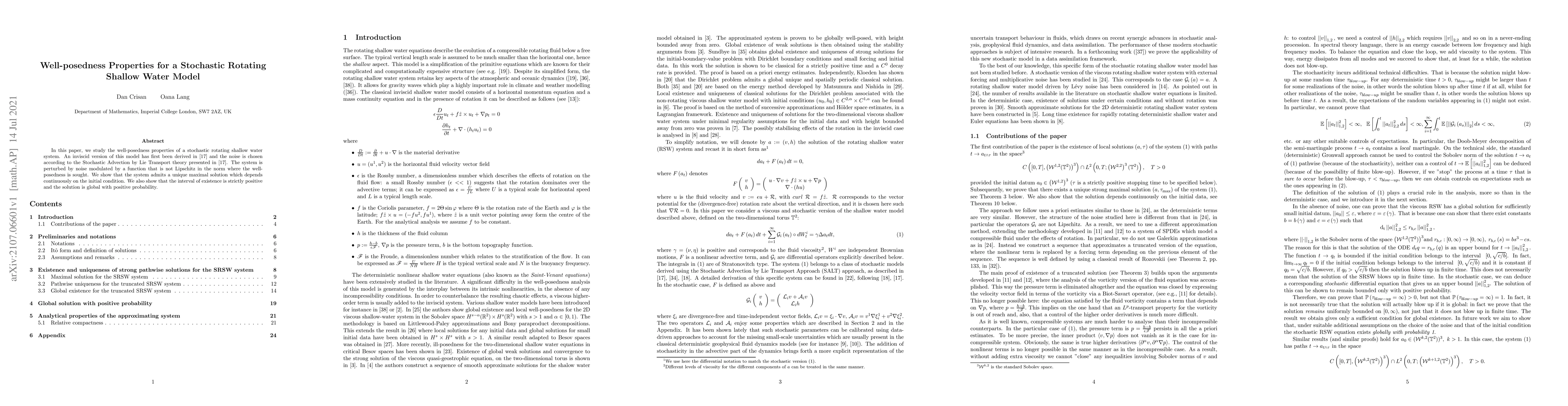This paper investigates the well-posedness of a stochastic rotating shallow water model, demonstrating the existence of a unique maximal strong solution that depends continuously on initial conditions. The solution is shown to exist globally with a positive probability, despite the noise not being Lipschitz in the relevant norm.