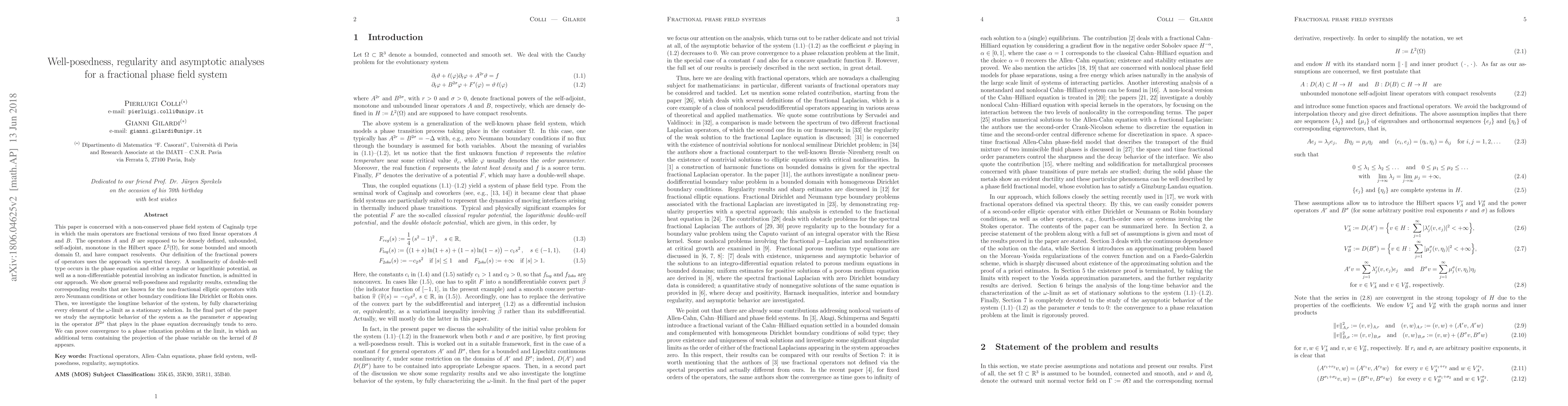 This paper is concerned with a non-conserved phase field system of Caginalp type in which the main operators are fractional versions of two fixed linear operators $A$ and $B$. The operators $A$ and $B$ are supposed to be densely defined, unbounded, self-adjoint, monotone in the Hilbert space $L^2(\Omega)$, for some bounded and smooth domain $\Omega$, and have compact resolvents. Our definition of the fractional powers of operators uses the approach via spectral theory. A nonlinearity of double-well type occurs in the phase equation and either a regular or logarithmic potential, as well as a non-differentiable potential involving an indicator function, is admitted in our approach. We show general well-posedness and regularity results, extending the corresponding results that are known for the non-fractional elliptic operators with zero Neumann conditions or other boundary conditions like Dirichlet or Robin ones. Then, we investigate the longtime behavior of the system, by fully characterizing every element of the $\omega$-limit as a stationary solution. In the final part of the paper we study the asymptotic behavior of the system as the parameter $\sigma$ appearing in the operator $B^{2\sigma}$ that plays in the phase equation decreasingly tends to zero. We can prove convergence to a phase relaxation problem at the limit, in which an additional term containing the projection of the phase variable on the kernel of $B$ appears.