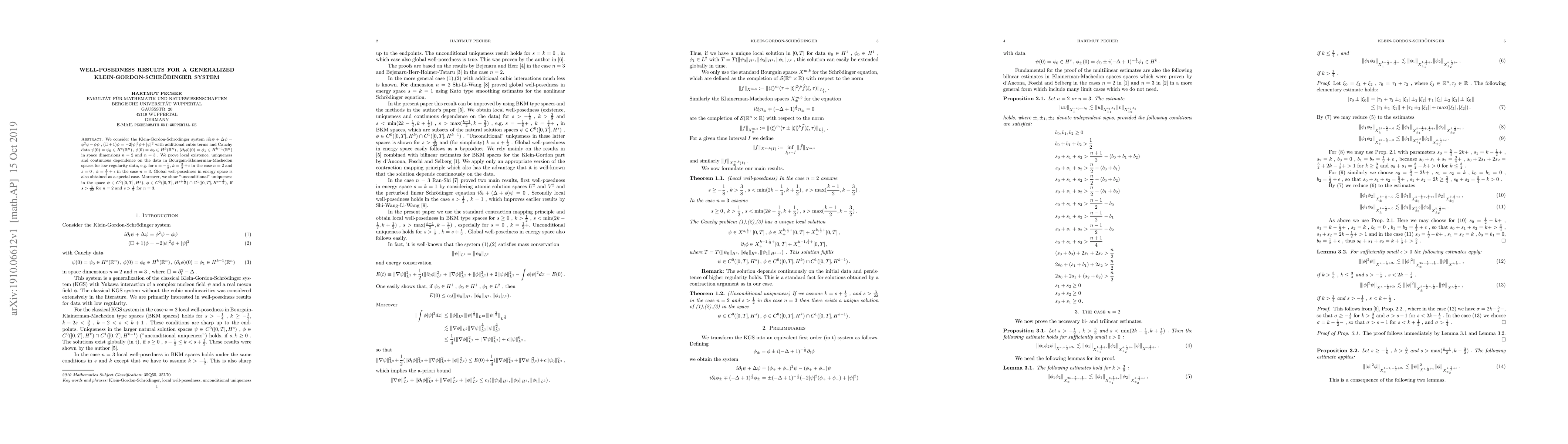 We consider the Klein-Gordon-Schr\"odinger system \begin{align*} i \partial_t \psi + \Delta \psi & = \phi^2 \psi - \phi \psi \\ (\Box +1)\phi & = -2|\psi|^2 \phi + |\psi|^2 \end{align*} with additional cubic terms and Cauchy data $$ \psi(0) = \psi_0 \in H^s({\mathbb R}^n) \, , \, \phi(0) = \phi_0 \in H^k({\mathbb R}^n) \, , \, (\partial_t \phi)(0) = \phi_1 \in H^{k-1}({\mathbb R}^n) $$ in space dimensions $n=2$ and $n=3$ . We prove local existence, uniqueness and continuous dependence on the data in Bourgain-Klainerman-Machedon spaces for low regularity data, e.g. for $s=-\frac{1}{8}$, $k=\frac{3}{8}+\epsilon$ in the case $n= 2$ and $s=0$ , $k=\frac{1}{2}+\epsilon$ in the case $n=3$. Global well-posedness in energy space is also obtained as a special case. Moreover, we show "unconditional" uniqueness in the space $\psi \in C^0([0,T],H^s) \, , \, \phi \in C^0([0,T],H^{s+\frac{1}{2}}) \cap C^1([0,T],H^{s-\frac{1}{2}})$, if $s > \frac{3}{22}$ for $n=2$ and $s > \frac{1}{2}$ for $n=3$.