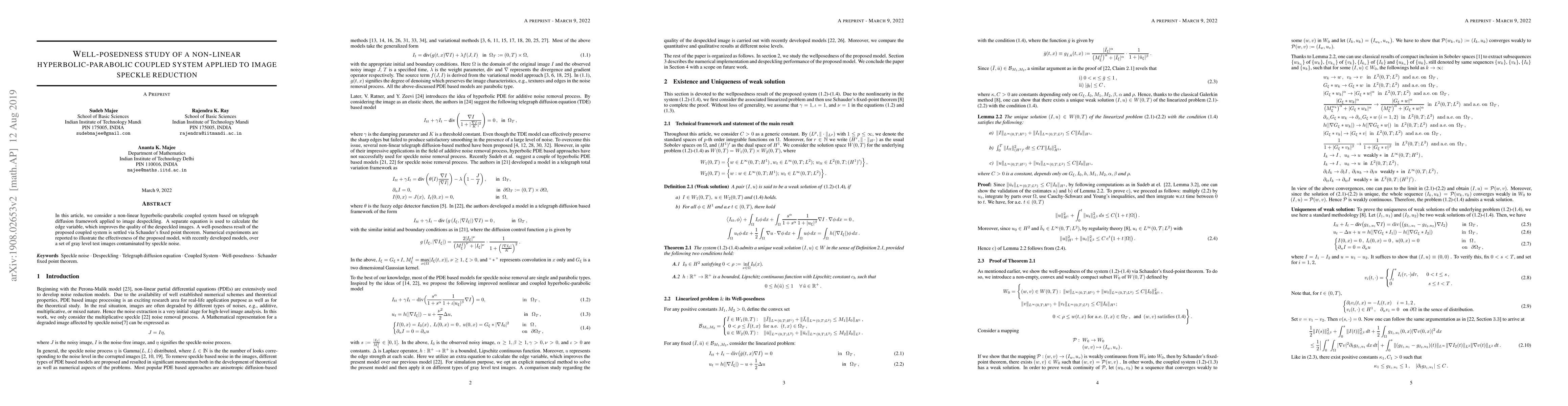 This research establishes the well-posedness of a non-linear hyperbolic-parabolic coupled system for image despeckling, using a telegraph diffusion framework and a separate edge variable calculation. Numerical experiments demonstrate the model's effectiveness on speckle-noise-contaminated gray level test images.
