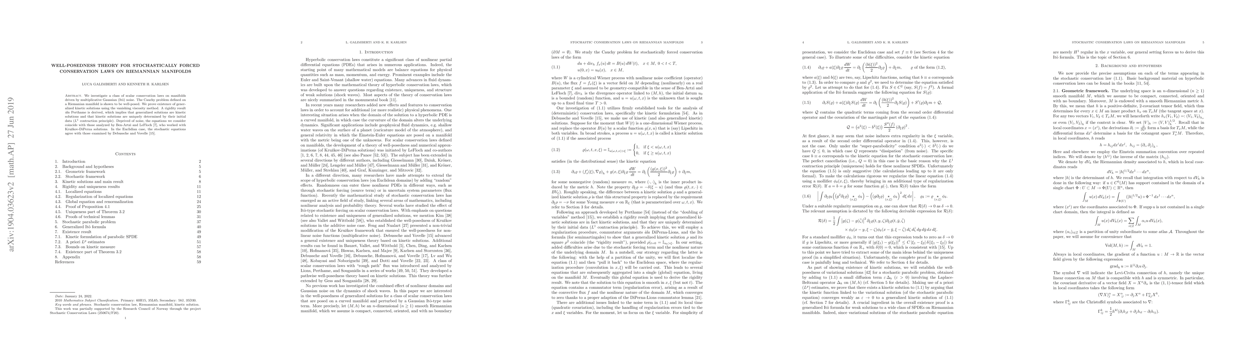 We investigate a class of scalar conservation laws on manifolds driven by multiplicative Gaussian (Ito) noise. The Cauchy problem defined on a Riemannian manifold is shown to be well-posed. We prove existence of generalized kinetic solutions using the vanishing viscosity method. A rigidity result is derived, which implies that generalized solutions are kinetic solutions and that kinetic solutions are uniquely determined by their initial data ($L^1$ contraction principle). Deprived of noise, the equations we consider coincide with those analyzed by Ben-Artzi and LeFloch (2007), who worked with Kruzkov-DiPerna solutions. In the Euclidian case, the stochastic equations agree with those examined by Debussche and Vovelle (2010).