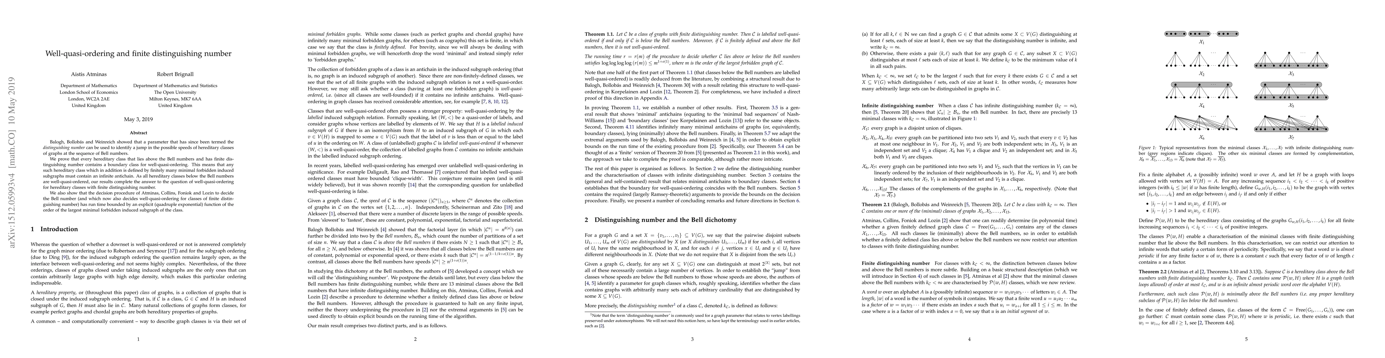Summary: The paper proves that hereditary graph classes above Bell numbers with finite distinguishing number contain a boundary class for well-quasi-ordering and an infinite antichain. It completes the well-quasi-ordering determination for such classes and shows that a specific decision procedure runs in quadruple exponential time based on the largest minimal forbidden induced subgraph.