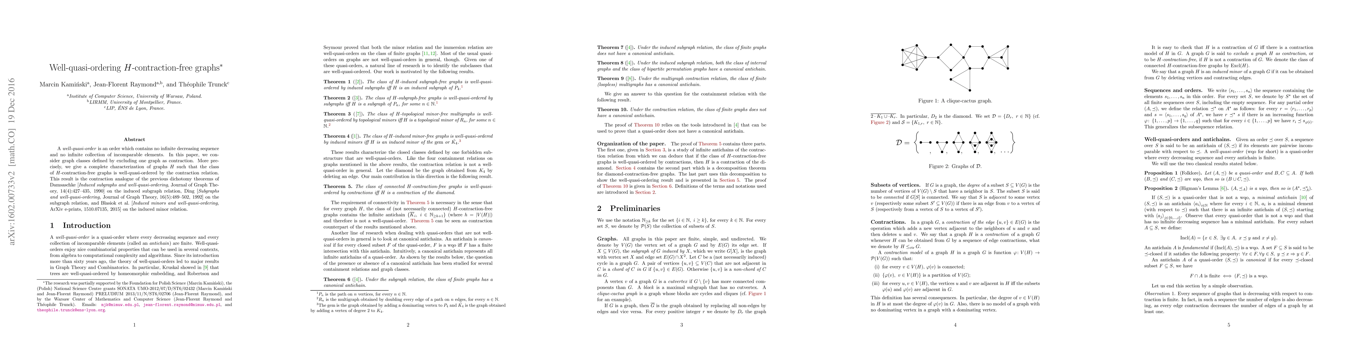 This paper characterizes graph classes excluding a specific graph under contraction such that the resulting H-contraction-free graphs form a well-quasi-order, analogous to previous results for induced subgraphs, subgraphs, and induced minors. The study provides a complete characterization for such graph classes.