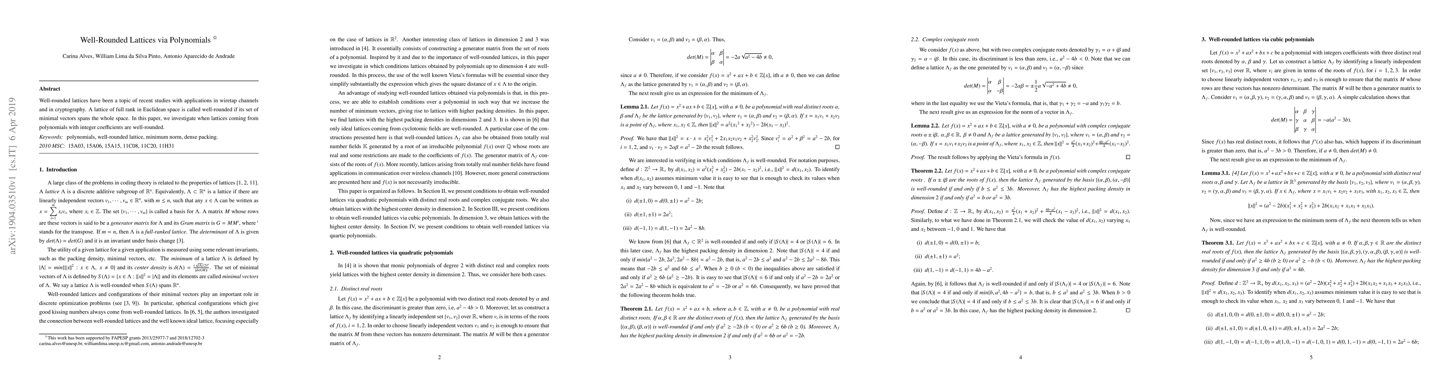 This paper explores the conditions under which lattices derived from polynomials with integer coefficients are well-rounded, with implications for applications in wiretap channels and cryptography. The focus is on identifying when such lattices span the entire Euclidean space through their minimal vectors.