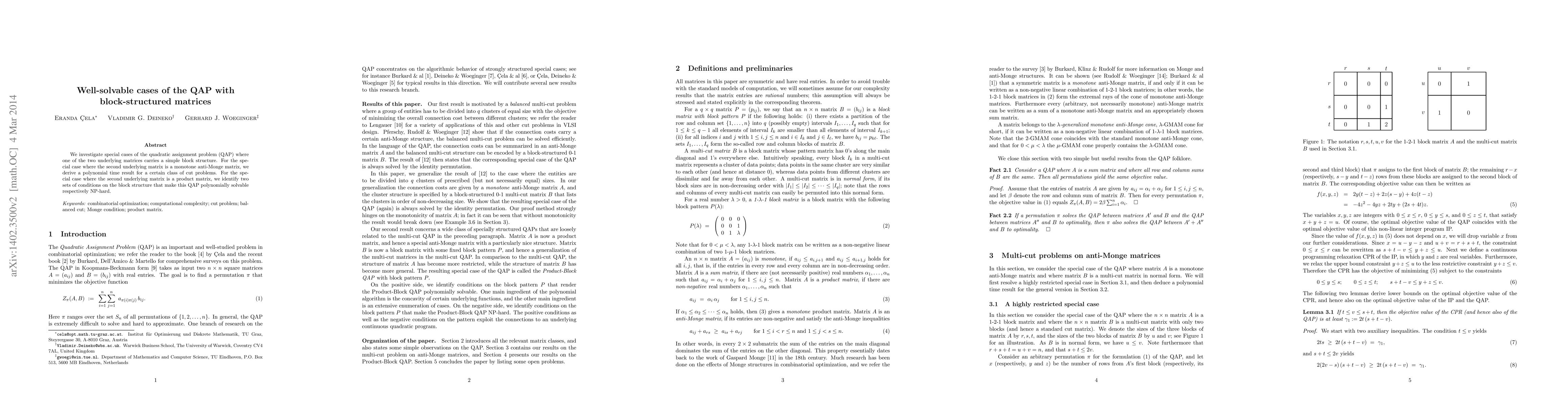 This paper explores special cases of the quadratic assignment problem (QAP) with block-structured matrices, deriving a polynomial time solution for QAP when the second matrix is monotone anti-Monge, and identifying conditions for polynomial solvability or NP-hardness when it is a product matrix.