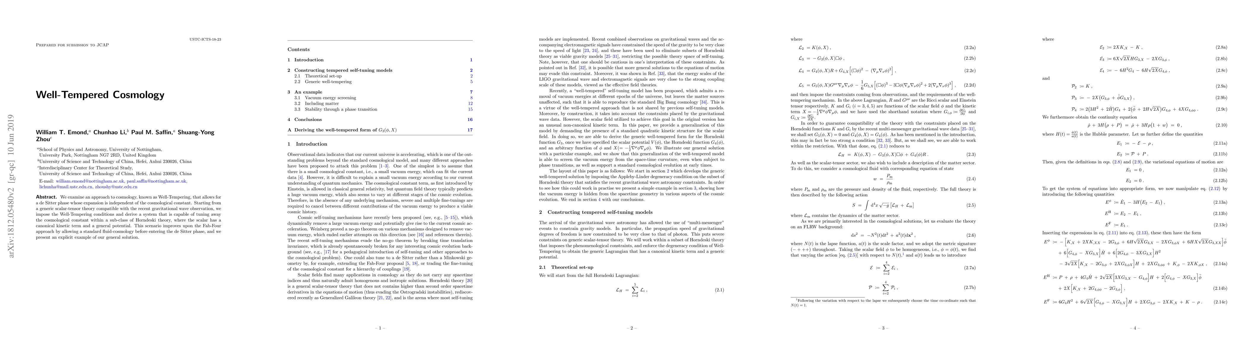 We examine an approach to cosmology, known as Well-Tempering, that allows for a de Sitter phase whose expansion is independent of the cosmological constant. Starting from a generic scalar-tensor theory compatible with the recent gravitational wave observation, we impose the Well-Tempering conditions and derive a system that is capable of tuning away the cosmological constant within a sub-class of Horndeski theory, where the scalar has a canonical kinetic term and a general potential. This scenario improves upon the Fab-Four approach by allowing a standard fluid-cosmology before entering the de Sitter phase, and we present an explicit example of our general solution.