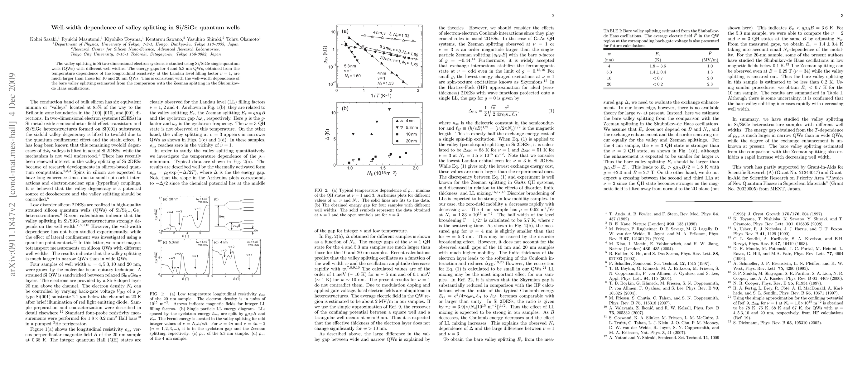 The study reveals that valley splitting in Si/SiGe quantum wells significantly depends on well width, with smaller wells (4 and 5.3 nm) exhibiting much larger energy gaps compared to larger wells (10 and 20 nm), as evidenced by resistivity measurements and Shubnikov-de Haas oscillations.