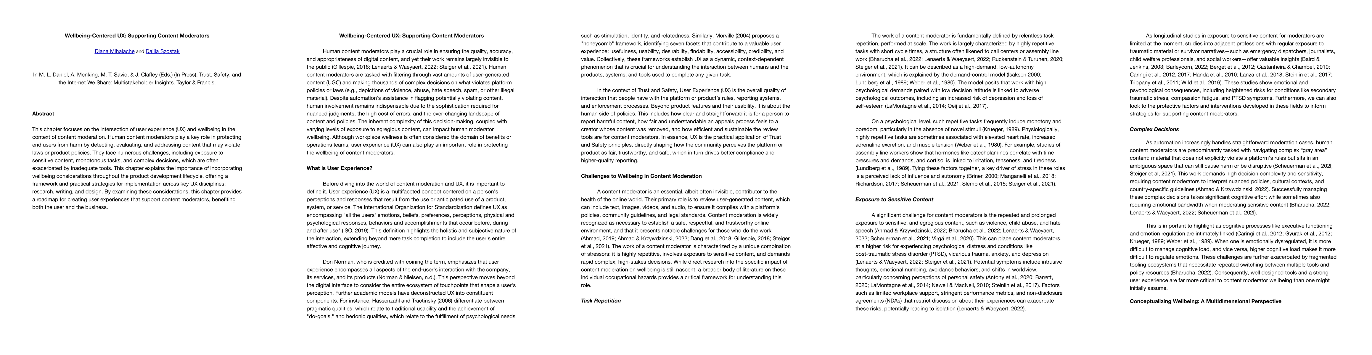 This chapter focuses on the intersection of user experience (UX) and wellbeing in the context of content moderation. Human content moderators play a key role in protecting end users from harm by detecting, evaluating, and addressing content that may violate laws or product policies. They face numerous challenges, including exposure to sensitive content, monotonous tasks, and complex decisions, which are often exacerbated by inadequate tools. This chapter explains the importance of incorporating wellbeing considerations throughout the product development lifecycle, offering a framework and practical strategies for implementation across key UX disciplines: research, writing, and design. By examining these considerations, this chapter provides a roadmap for creating user experiences that support content moderators, benefiting both the user and the business.