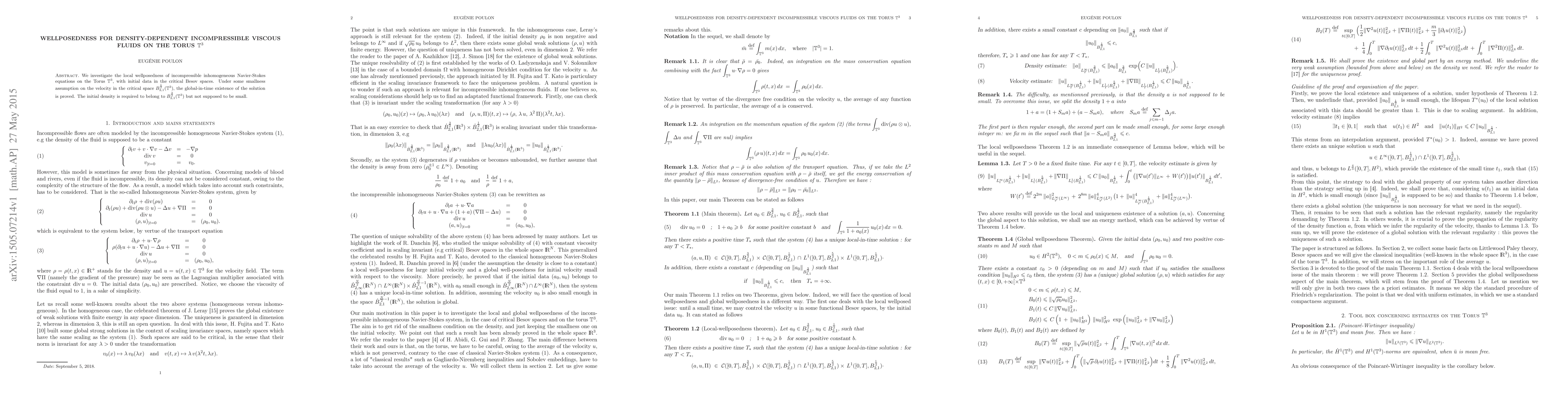 We investigate the local wellposedness of incompressible inhomogeneous Navier-Stokes equations on the Torus $\T^3$, with initial data in the critical Besov spaces. Under some smallness assumption on the velocity in the critical space $B^{\frac{1}{2}}\_{2,1}(\T^3)$, the global-in-time existence of the solution is proved. The initial density is required to belong to~$B^{\frac{3}{2}}\_{2,1}(\T^3)$ but not supposed to be small.