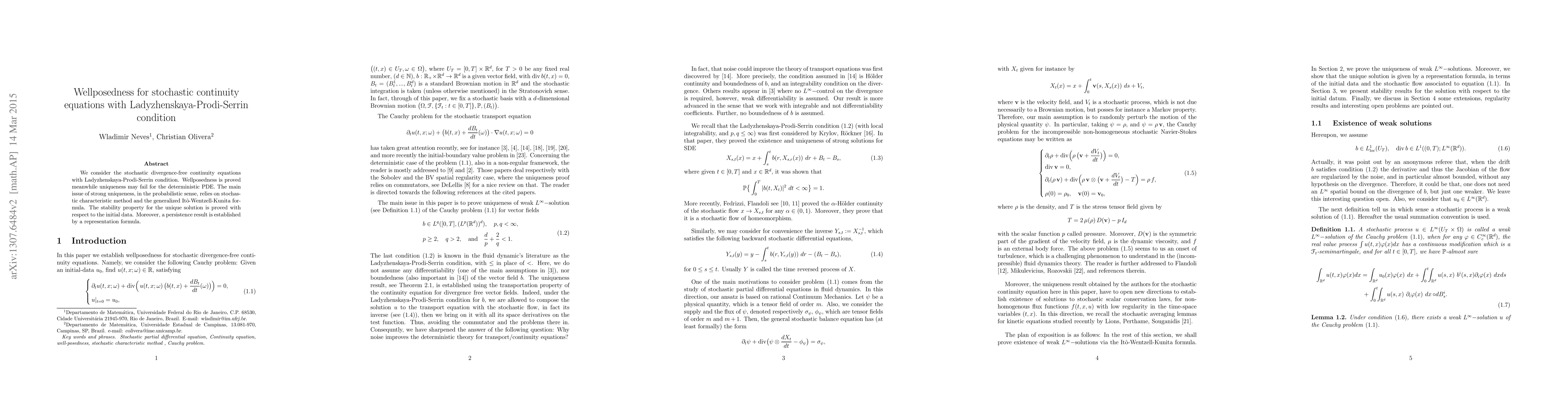 This paper investigates wellposedness for stochastic continuity equations with a Ladyzhenskaya-Prodi-Serrin condition, proving uniqueness while noting the potential failure of uniqueness in deterministic PDEs.