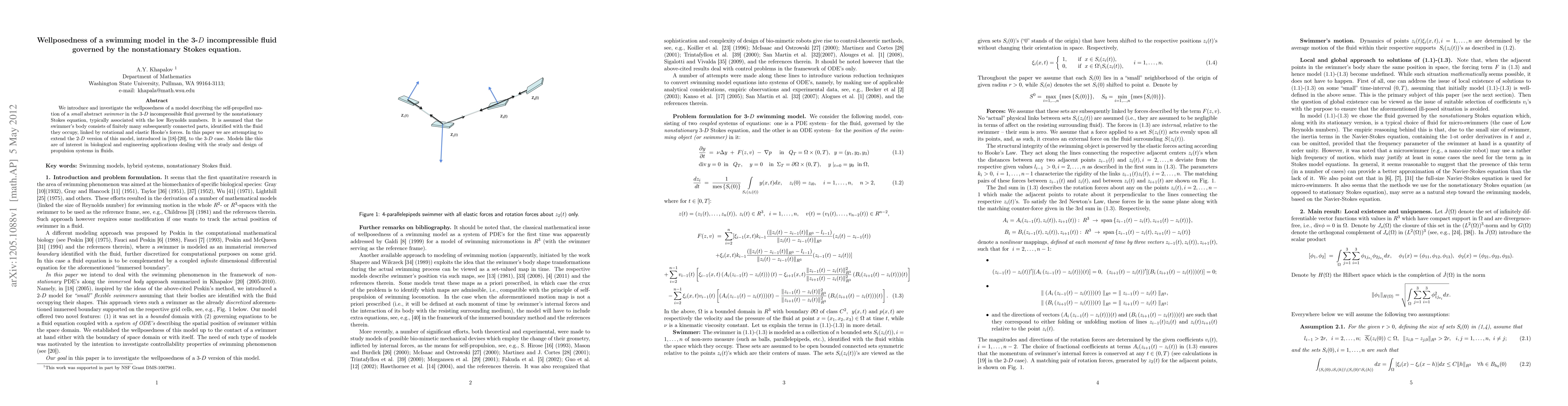 We introduce and investigate the wellposedness of a model describing the self-propelled motion of a small abstract swimmer in the 3-D incompressible fluid governed by the nonstationary Stokes equation, typically associated with the low Reynolds numbers. It is assumed that the swimmer's body consists of finitely many subsequently connected parts, identified with the fluid they occupy, linked by rotational and elastic Hooke's forces. In this paper we are attempting to extend the 2-D version of this model, introduced in [18]-[20], to the 3-D case. Models like this are of interest in biological and engineering applications dealing with the study and design of propulsion systems in fluids.
