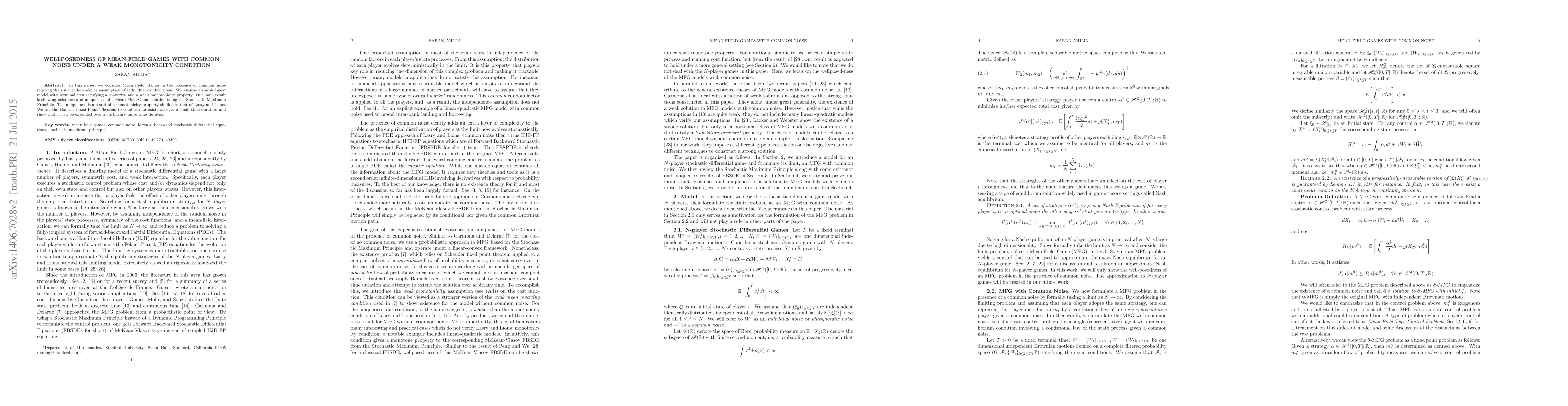 This paper establishes the wellposedness of Mean Field Games with common noise, relaxing the independence assumption of individual random noise. It proves the existence and uniqueness of solutions via the Stochastic Maximum Principle and extends this to an arbitrary finite time duration using the Banach Fixed Point Theorem.