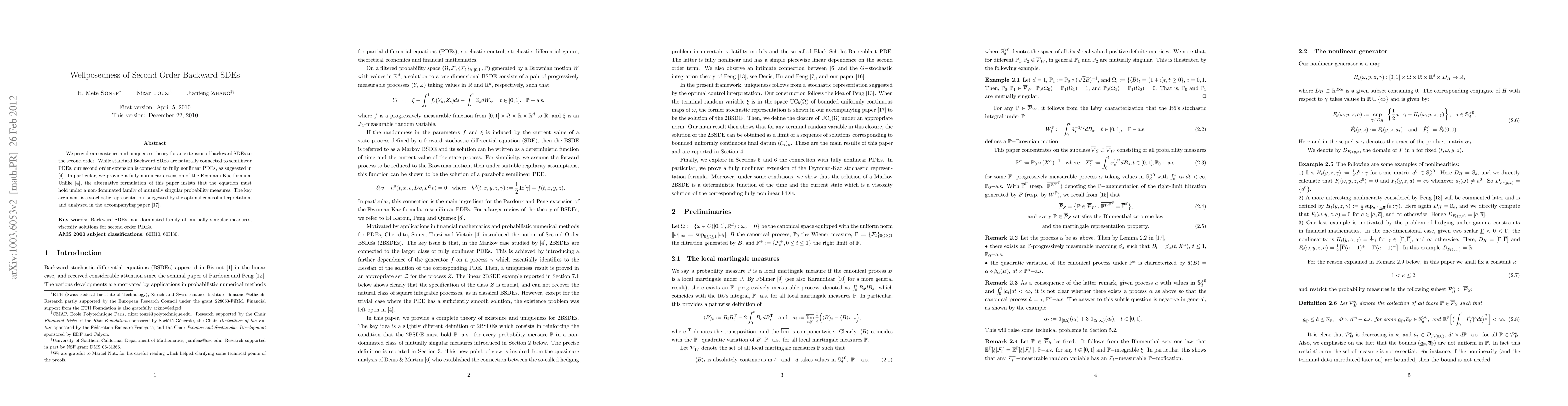 We provide an existence and uniqueness theory for an extension of backward SDEs to the second order. While standard Backward SDEs are naturally connected to semilinear PDEs, our second order extension is connected to fully nonlinear PDEs, as suggested by Cheridito et.al. In particular, we provide a fully nonlinear extension of the Feynman-Kac formula. Unlike the earlier papers, the alternative formulation of this paper insists that the equation must hold under a non-dominated family of mutually singular probability measures. The key argument is a stochastic representation, suggested by the optimal control interpretation, and analyzed in our accompanying paper