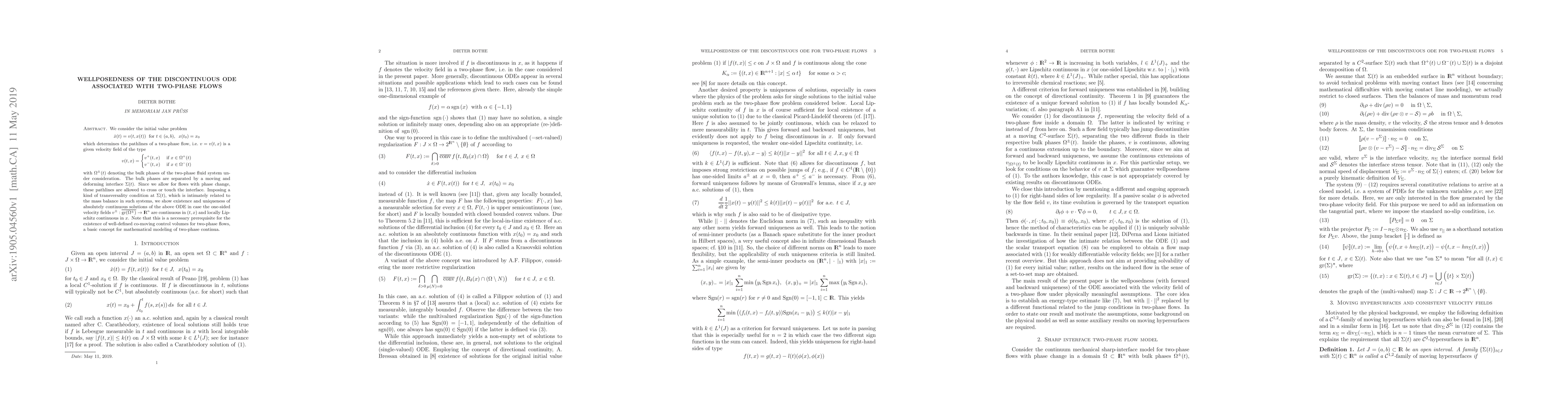 We consider the initial value problem \[ \dot x (t) = v(t,x(t)) \;\mbox{ for } t\in (a,b), \;\; x(t_0)=x_0 \] which determines the pathlines of a two-phase flow, i.e.\ $v=v(t,x)$ is a given velocity field of the type \[ v(t,x)= \begin{cases} v^+(t,x) &\text{ if } x \in \Omega^+(t)\\ v^-(t,x) &\text{ if } x \in \Omega^-(t) \end{cases} \] with $\Omega^\pm (t)$ denoting the bulk phases of the two-phase fluid system under consideration. The bulk phases are separated by a moving and deforming interface $\Sigma (t)$. Since we allow for flows with phase change, these pathlines are allowed to cross or touch the interface. Imposing a kind of transversality condition at $\Sigma (t)$, which is intimately related to the mass balance in such systems, we show existence and uniqueness of absolutely continuous solutions of the above ODE in case the one-sided velocity fields $v^\pm:\overline{{\rm gr}(\Omega^\pm)}\to \mathbb{R}^n$ are continuous in $(t,x)$ and locally Lipschitz continuous in $x$. Note that this is a necessary prerequisite for the existence of well-defined co-moving control volumes for two-phase flows, a basic concept for mathematical modeling of two-phase continua.