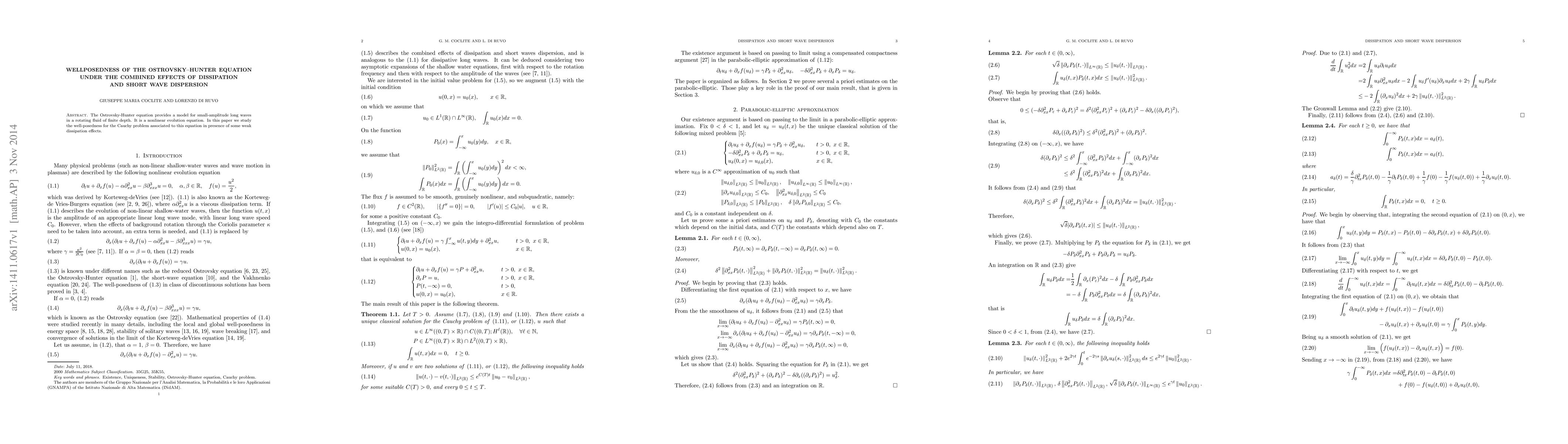 Summary: This paper investigates the well-posedness of the Ostrovsky-Hunter equation, a model for small-amplitude long waves in a rotating fluid, under the influence of weak dissipation and short wave dispersion. The study focuses on the existence, uniqueness, and continuous dependence of solutions to the associated Cauchy problem.