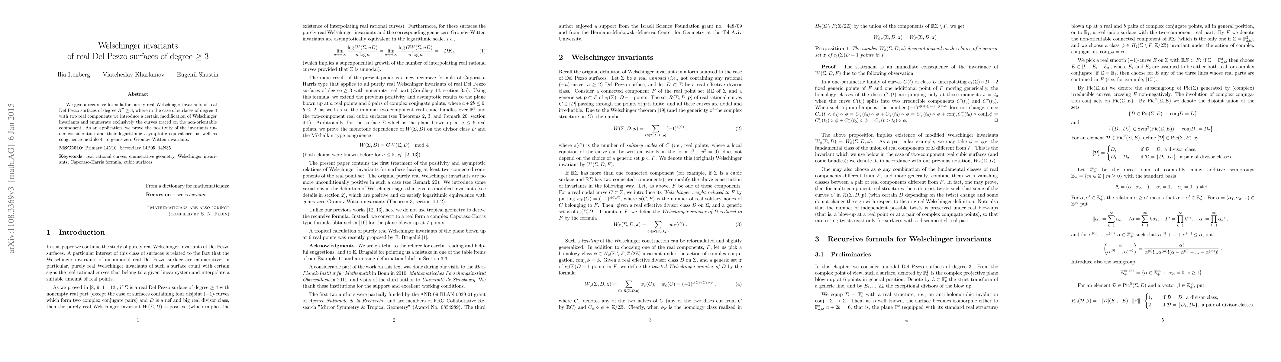 The paper presents a recursive formula for purely real Welschinger invariants of real Del Pezzo surfaces of degree $K^2 \ge 3$, with special treatment for degree $3$ surfaces with two components, and proves their positivity, asymptotic equivalence, and congruence modulo $4$ to genus zero Gromov-Witten invariants.