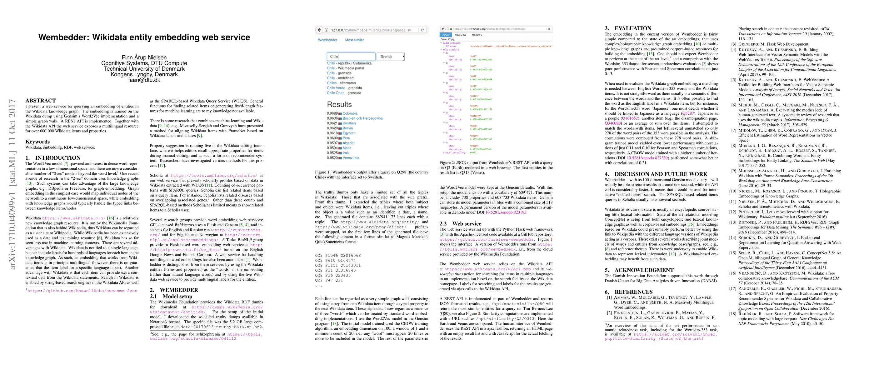 Summary: Wembedder provides a web service for querying entity embeddings in the Wikidata knowledge graph, trained using Gensim's Word2Vec and a graph walk, accessible via a REST API alongside the Wikidata API for over 600,000 multilingual items and properties.
