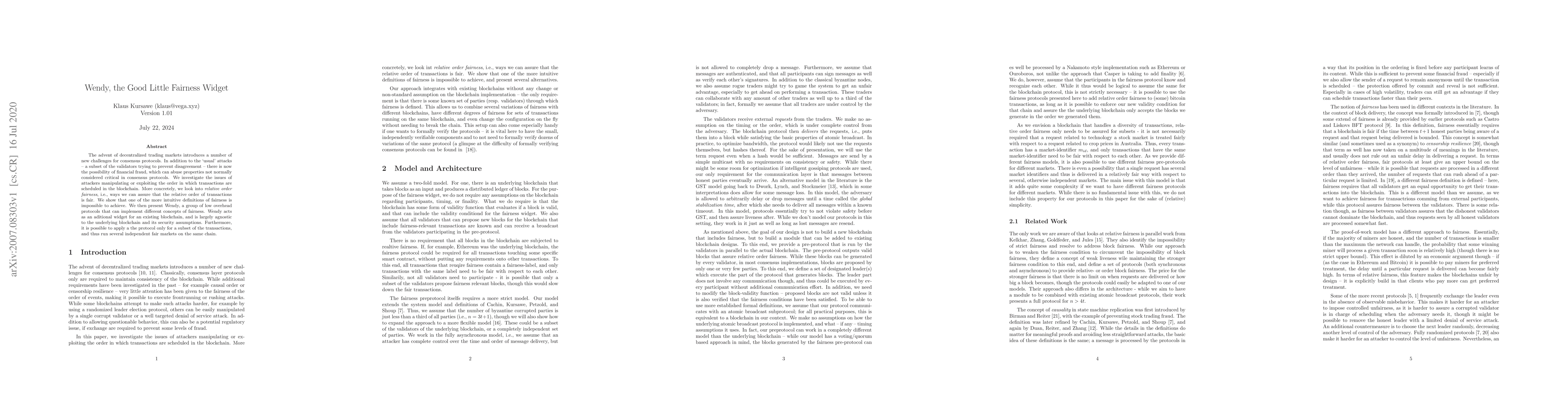 The advent of decentralized trading markets introduces a number of new challenges for consensus protocols. In addition to the `usual' attacks -- a subset of the validators trying to prevent disagreement -- there is now the possibility of financial fraud, which can abuse properties not normally considered critical in consensus protocols. We investigate the issues of attackers manipulating or exploiting the order in which transactions are scheduled in the blockchain. More concretely, we look into relative order fairness, i.e., ways we can assure that the relative order of transactions is fair. We show that one of the more intuitive definitions of fairness is impossible to achieve. We then present Wendy, a group of low overhead protocols that can implement different concepts of fairness. Wendy acts as an additional widget for an existing blockchain, and is largely agnostic to the underlying blockchain and its security assumptions. Furthermore, it is possible to apply a the protocol only for a subset of the transactions, and thus run several independent fair markets on the same chain.