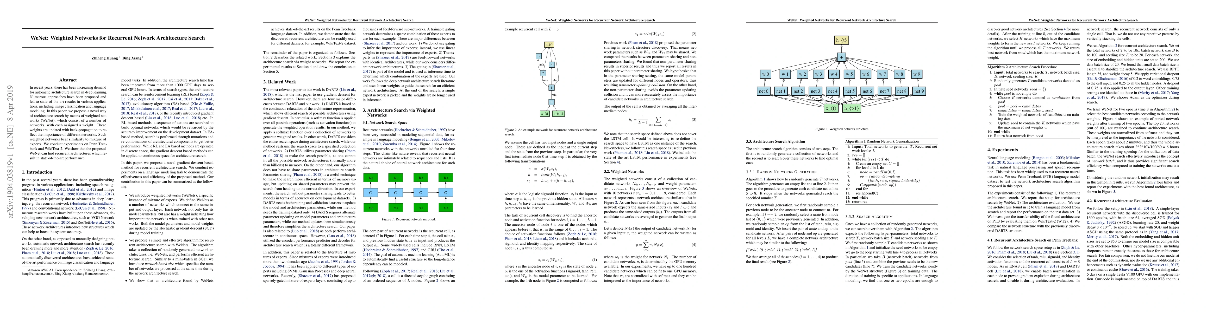 The paper introduces WeNet, a novel architecture search method using weighted networks that dynamically adjust the importance of different networks through back-propagation. Experiments on Penn Treebank and WikiText-2 demonstrate WeNet's effectiveness in discovering recurrent architectures with state-of-the-art performance.
