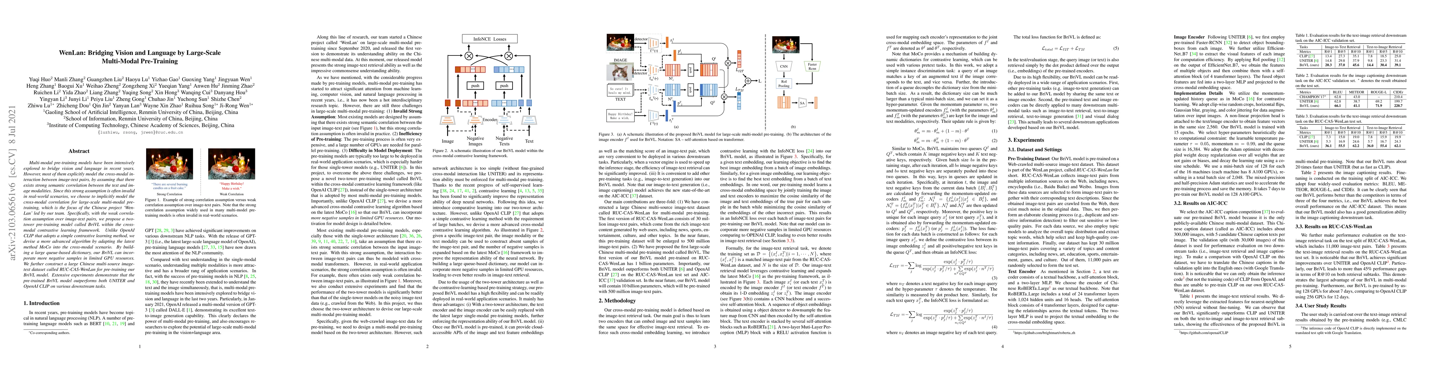 The WenLan project introduces BriVL, a two-tower pre-training model for implicit cross-modal correlation in multi-modal pre-training, leveraging advanced contrastive learning and a large queue-based dictionary. The model outperforms UNITER and CLIP on various tasks, demonstrating the effectiveness of its approach.