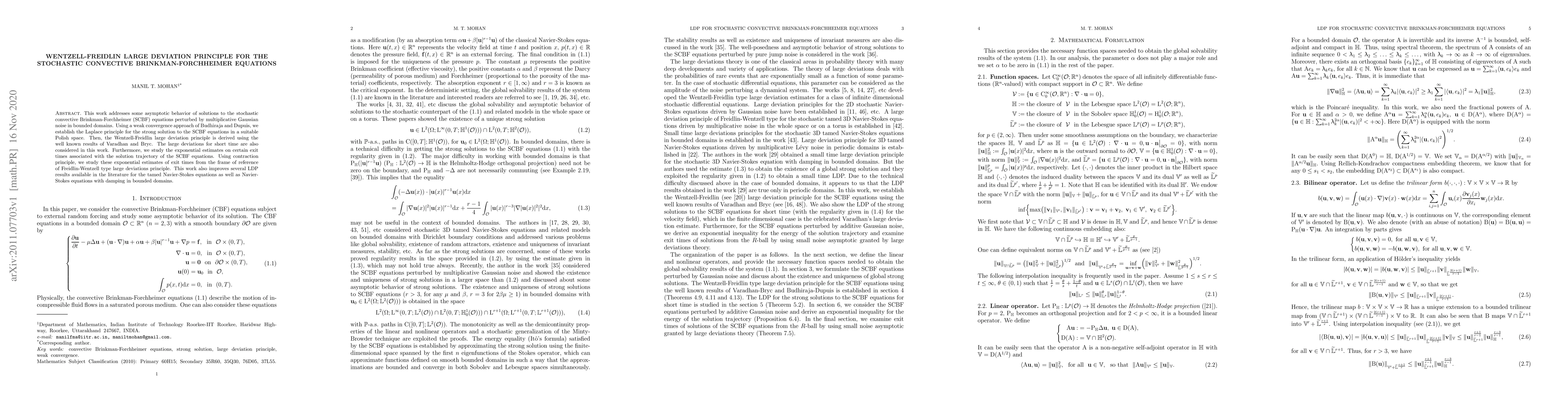 The paper presents a detailed derivation of the Wentzell-Freidlin large deviation principle for the SCBF equations, along with exponential estimates on exit times, contributing to the theory of stochastic processes and fluid dynamics.