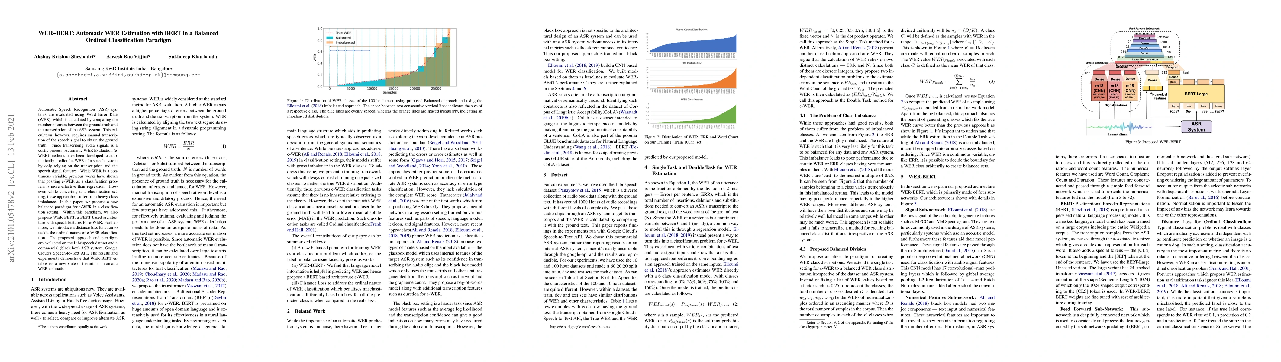 The paper proposes WER-BERT, a BERT-based architecture that achieves state-of-the-art in automatic Word Error Rate estimation, using a balanced ordinal classification paradigm to tackle class imbalance and incorporate distance loss functions.