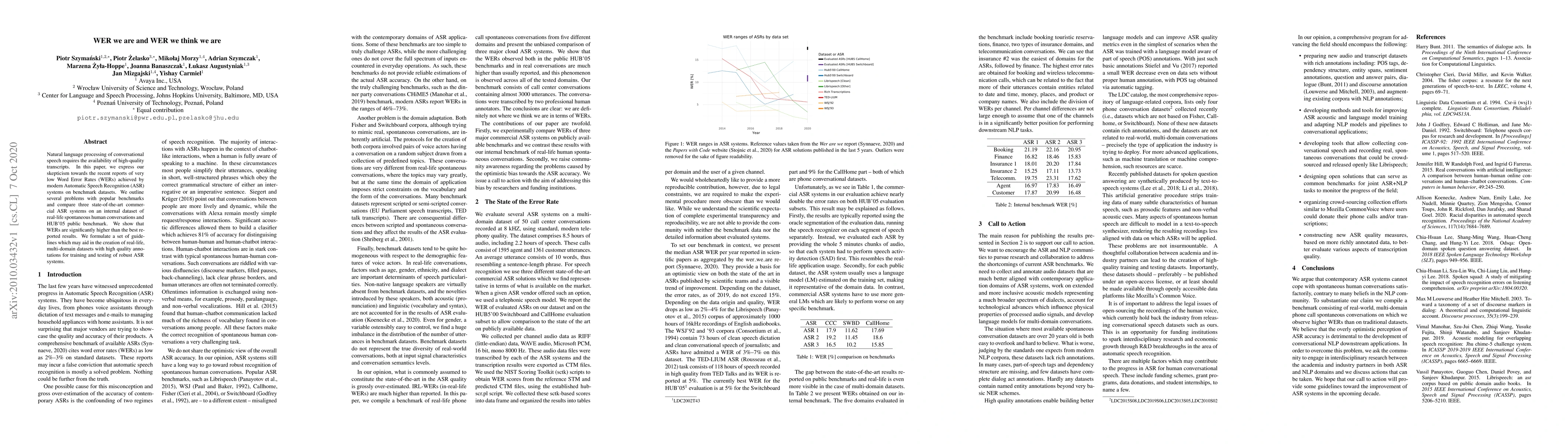 Natural language processing of conversational speech requires the availability of high-quality transcripts. In this paper, we express our skepticism towards the recent reports of very low Word Error Rates (WERs) achieved by modern Automatic Speech Recognition (ASR) systems on benchmark datasets. We outline several problems with popular benchmarks and compare three state-of-the-art commercial ASR systems on an internal dataset of real-life spontaneous human conversations and HUB'05 public benchmark. We show that WERs are significantly higher than the best reported results. We formulate a set of guidelines which may aid in the creation of real-life, multi-domain datasets with high quality annotations for training and testing of robust ASR systems.