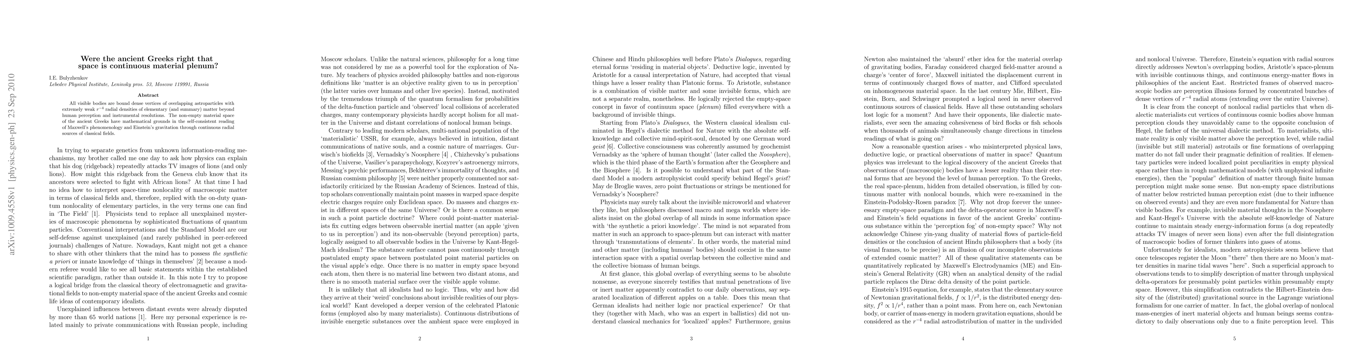 All visible bodies are bound dense vertices of overlapping astroparticles with extremely weak r^{-4} radial densities of elementary (and summary) matter beyond human perception and instrumental resolutions. The non-empty material space of the ancient Greeks have mathematical grounds in the self-consistent reading of Maxwell's phenomenology and Einstein's gravitation through continuous radial sources of classical fields.